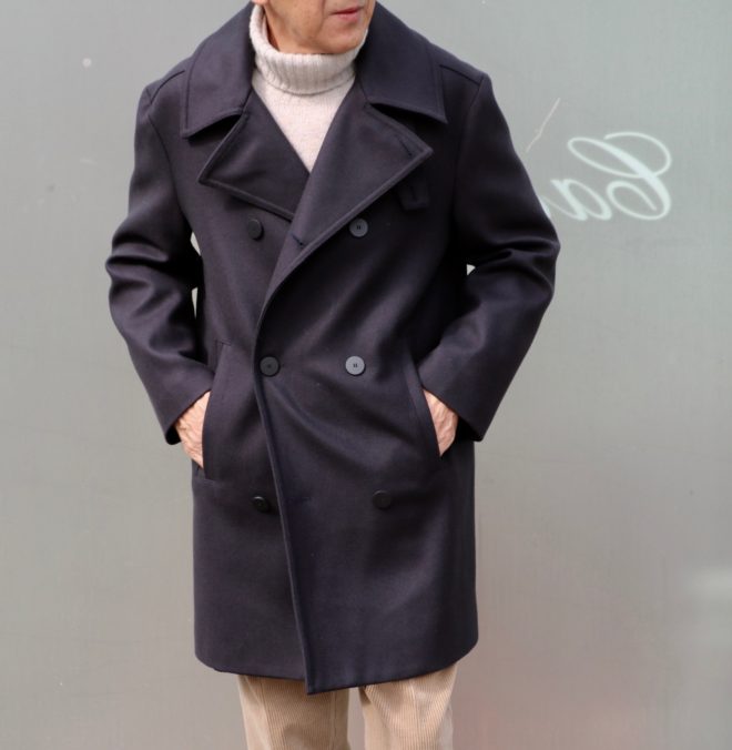 その余韻もあり、”柳の下のドジョウ”というわけにはいかないのは重々承知でご提案させていただくのが、Solleciti/ソレシティのメルトン リーファーコートです。1945年イタリアミラノで創業の老舗毛皮メーカーが提案するラグジュアリーブランドです。ブログにも書かせていただきましたが、ゴージャスなものに馴染めない私。いつもなら素通りしてしまうブランドですが、このリーファーコートだけは見逃せませんでした。ただ、タイトに着ることに慣れている方にとっては、ややオーバーサイズ気味のシルエットに抵抗があったのかもしれません。写真の着用サイズも44とクラシコブランドのサイズ感よりゆったりしています。ちょうど、緩めに移行する時でもあり、あれから時が過ぎてみれば、程よいフォルムと言えるかもしれません。価格以上に魅力のあるセクシーなPコートです。よろしければ、このタイミングで手に入れてみてはいかがでしょう。