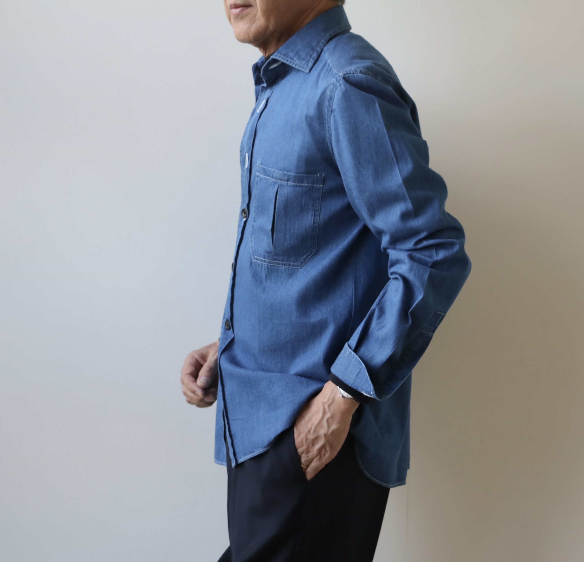 Errico Formicola/エリコ フォルミコラの「GIANNI」シルク混デニム インバーテッドプリーツシャツも間違いなく春に活躍します。