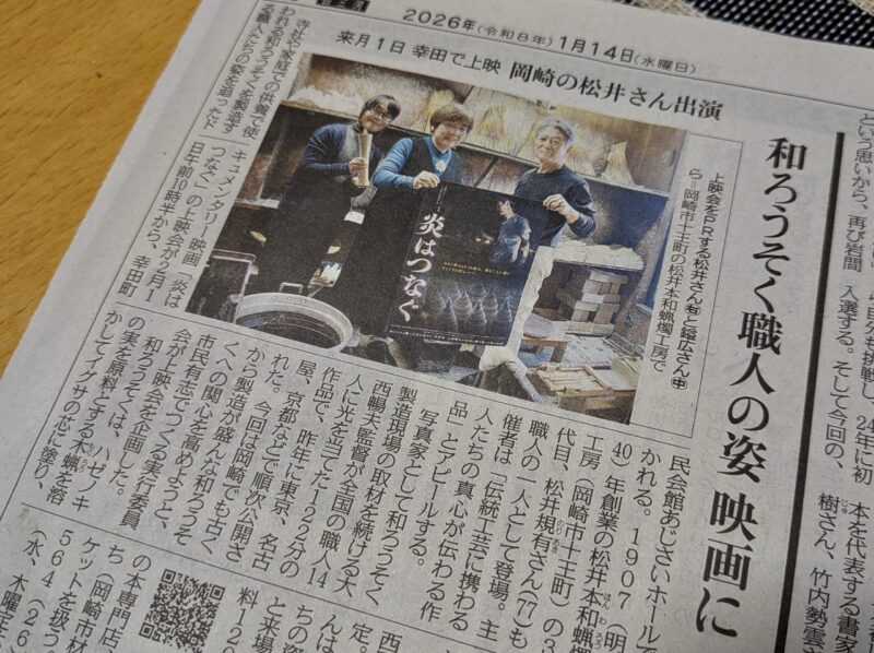 長年、ご贔屓にしてくださるお客様の記事が本日の新聞に掲載されていましたので、ご紹介します。仏教の伝来とともに大陸から伝わったと言われる和ろうそく。全国にみられた和ろうそく製造業者も、現在では、わずか20件ほど。内、3件が、信仰心篤く、寺社仏閣の多い、ここ岡崎にあります。その中の「松井本和蝋燭工房」の三代目、松井規有様は、ご来店された際にはいつも和ろうそくを情熱的に語ってくれます。記事の内容は、その製作に携わる職人たちの姿を追った映画「炎はつなぐ」に職人として登場されるという内容でした。一本の「和ろうそく」ができあがるまでに、さまざまな手仕事の技がつながっていく様子を映し出した映画です。日本の伝統工芸品を”つなぐ”ことの大切さをいつも語られているだけに応援したくなります。ご興味がございましたら、こちらをご覧ください。