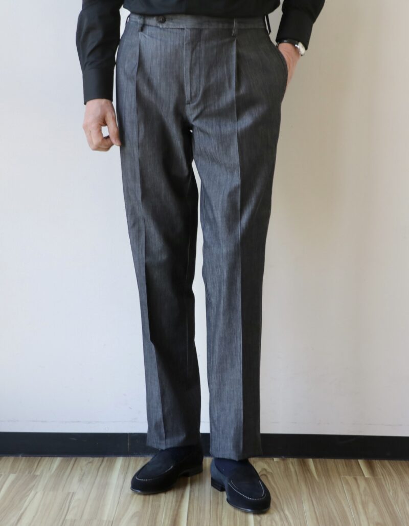 モデルは「STARK」。アウト1プリーツの裾幅20〜21cm幅のクラシックなモデルです。この秋冬、ご提案させていただいたのがウール素材のエレガントなパンツでした。来季は頑張っても10万を悠に超えてしまいますので、オーダーを見合わせております。サイズに限りがございますが、揃えられる価値は大いにあります。