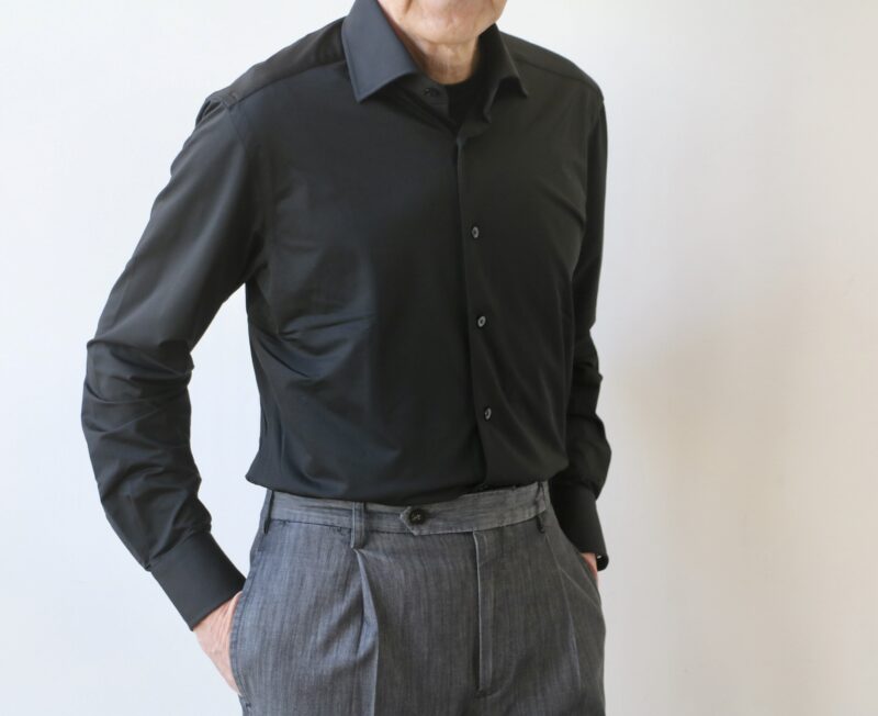 織生地のシャツと違い、編み地生地を使ったシャツ。スーピマコットンの薄手で伸縮性のある快適素材です。
