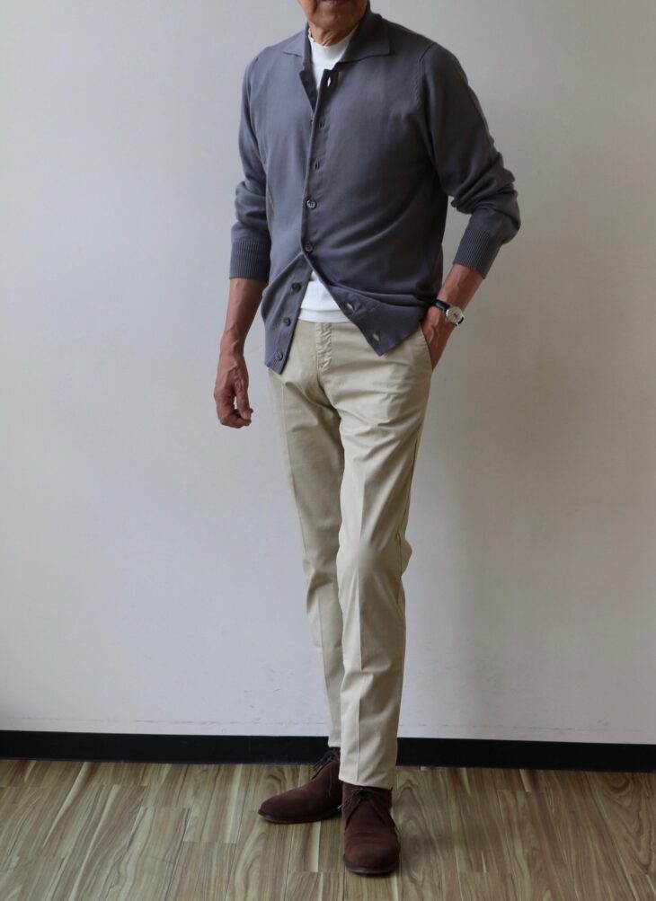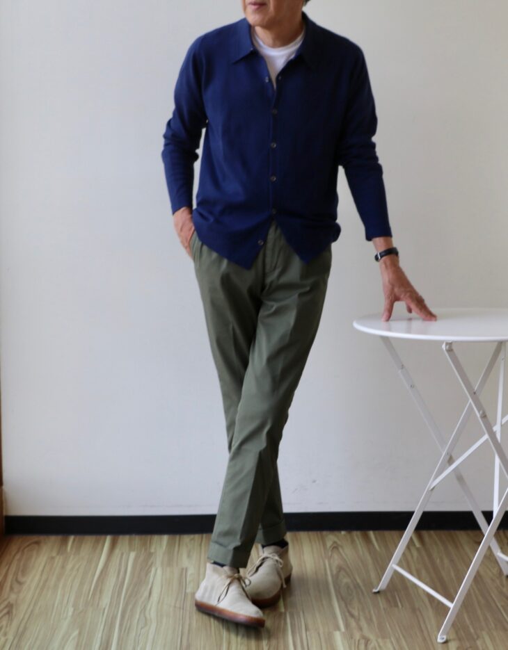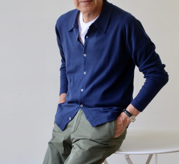 羽織ったのは、【JOHN SMEDLEY/ジョン・スメドレー】。モデル名は「WOODFORD」 。今季の新型モデルとして登場した、襟付きのフルボタンカーディガンです。