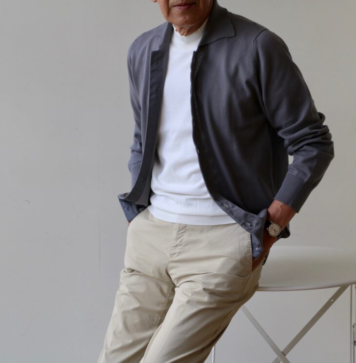 オフィスの冷房対策にも使えると、本日、M様の元へ旅立っていった【WILLIAM LOCKIE/ウィリアムロッキー】のソフトコットン襟付きフルボタンカーディガン。ポロ襟カーディガンと呼んでも良さそうです。エレファントグレイのサイズ42をややゆとりを持って着ています。襟がつくことで、Vカーディガンよりアクティブな印象にもなります。秋にも活躍することは間違いありません。