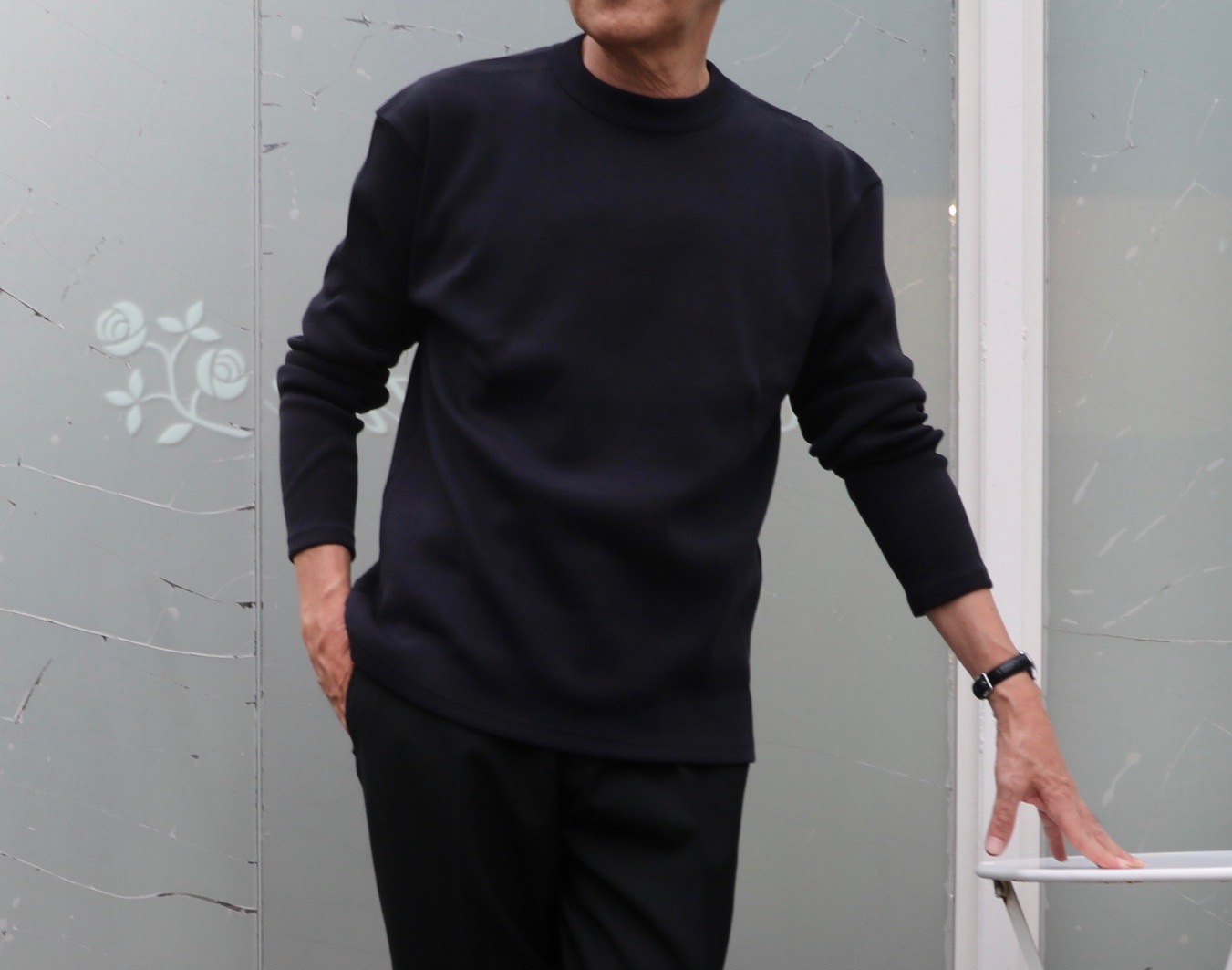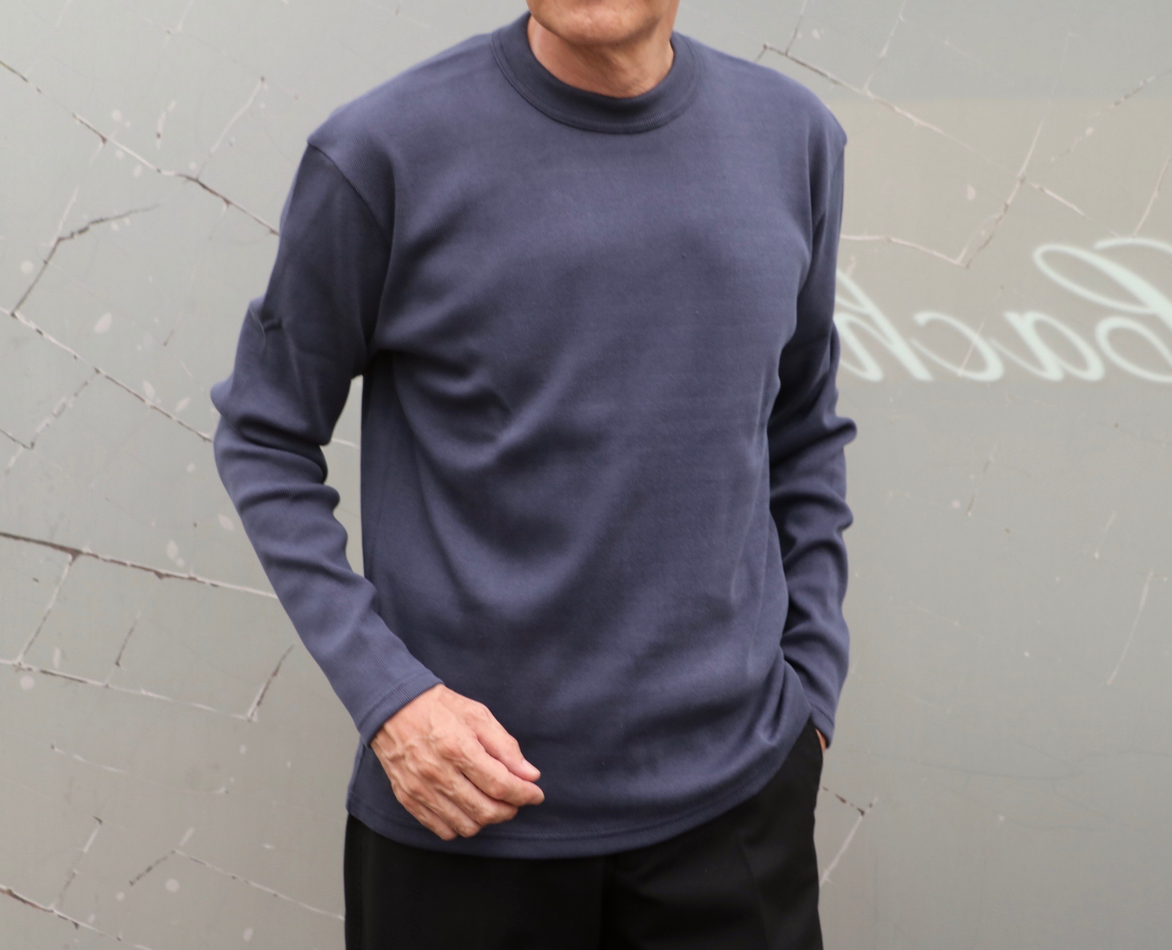 今回、ロングスリーブのクルーネックでセレクトしたのは、インディゴとネイビー。インディゴは新色になります。ミリタリーカットソーの無骨さをより上質に、そしてエレガントに仕上げています。