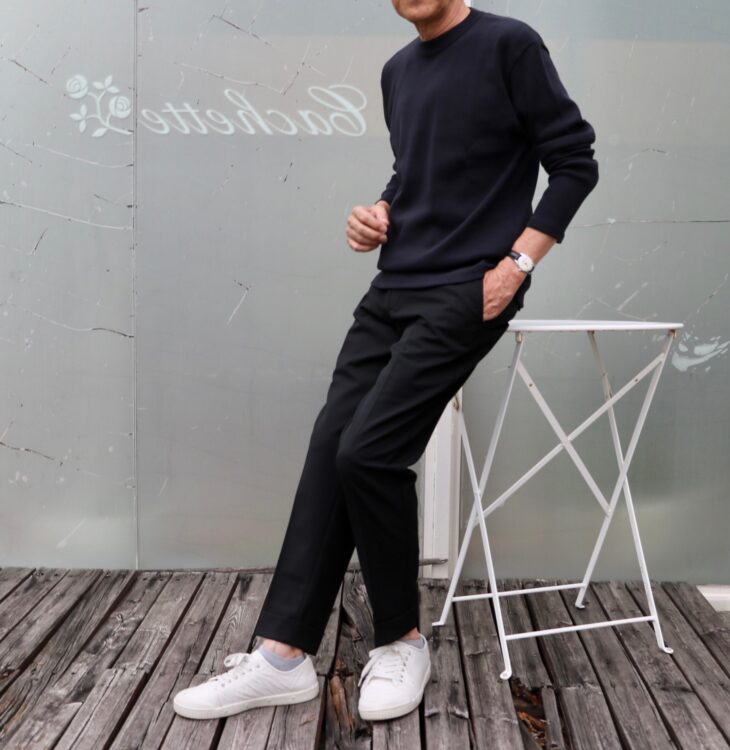 上はサイズSを、下はMを着ています。通常、46のサイズを選ぶ私スグルシニア。ジャストで着るか、ゆとりを持つかで選ぶサイズは変わります。目安としては、サイズSが44~46、Mで46~48、Lで48~50になるでしょうか。
