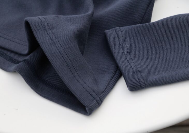 フライス生地のカットソーです。織物ではなく編物で生地が編み上がったら裁断して縫い合わせています。表面は縦に編み目が走り、裏側は横に編み目があれば、一般的にいうTシャツやパーカーに見る「メリヤス編み」。表面の編み目も裏面の編み目も縦に編み目があるのがフライス編みです。ゴム編みともいうように、ゴムのような伸縮性と適度な厚みが特徴になります。