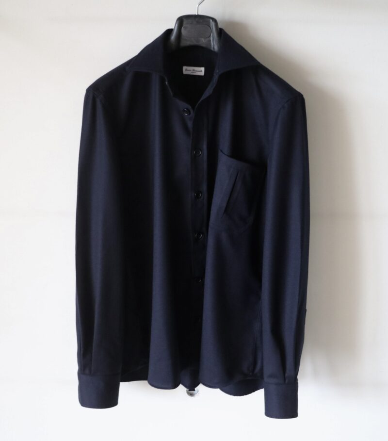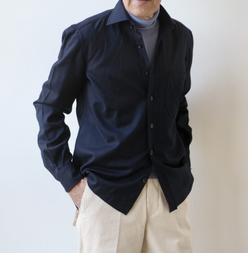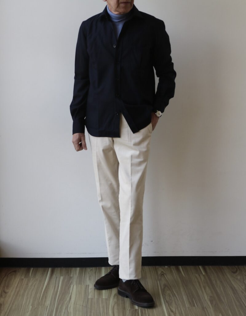 ネイビーにブルー、オフホワイトのウィンターマリンを思わせる爽やかな組み合わせです。フランネルタッチのシャツにゼニスブルーがよく合います。ゼニスには英語で天頂、頂点や絶頂という意味があり、空をイメージする色です。同じ空の色を表す青色にスカイブルーがありますが、ゼニスブルーはスカイブルーよりも紫みが強くすこし暗い色合いが特徴になります。