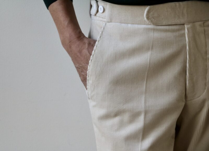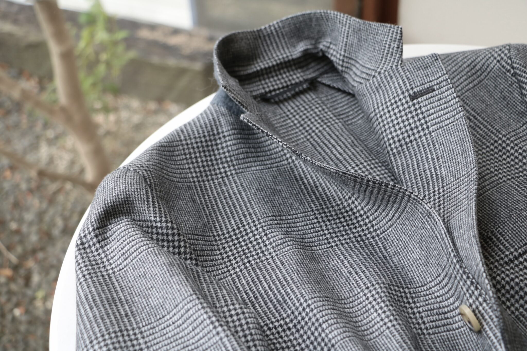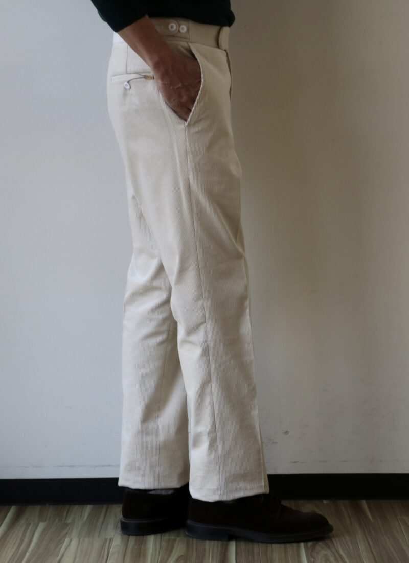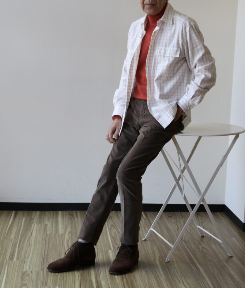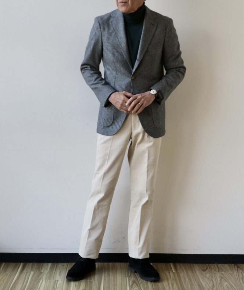 白黒ほど強弱のない柔らかなモノクロのグレンチェック柄ジャケットにオフホワイトのコーデュロイパンツを合わせてみました。ボトムはカシェートのもので後ほどご紹介させていただきます。