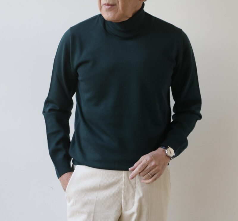 新色トリオのメリノウール12ゲージタートルネックセーターです。柄物が戻って来ている今季、ベーシックカラー以外の色も注目されています。