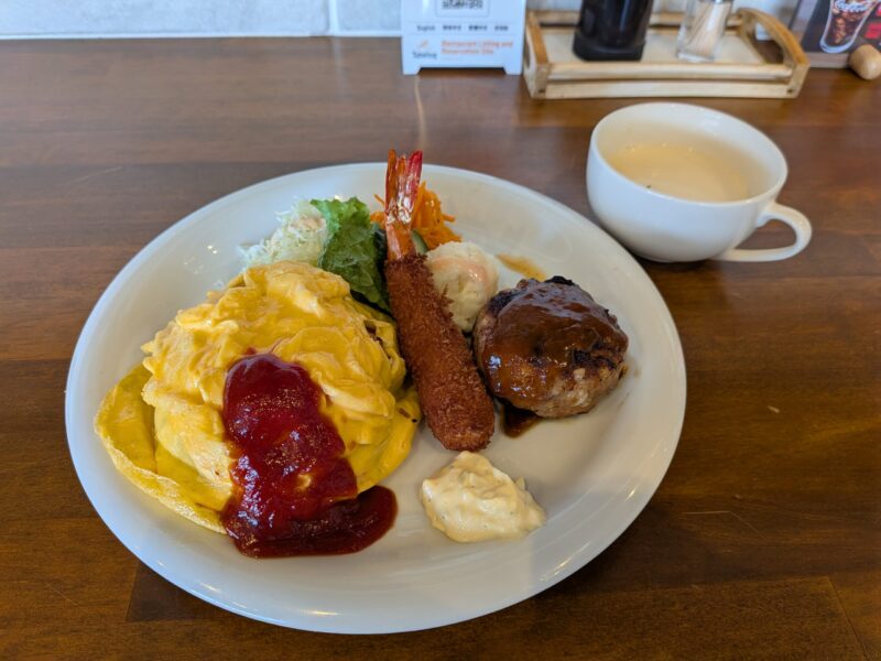本日のご案内は、ハンバーグにエビフライにオムライスとモリモリで色鮮やかです。いや、これは私の本日の昼食でした。ボリューム満点。好きなものばかりで、つい食べ過ぎてしまいました。