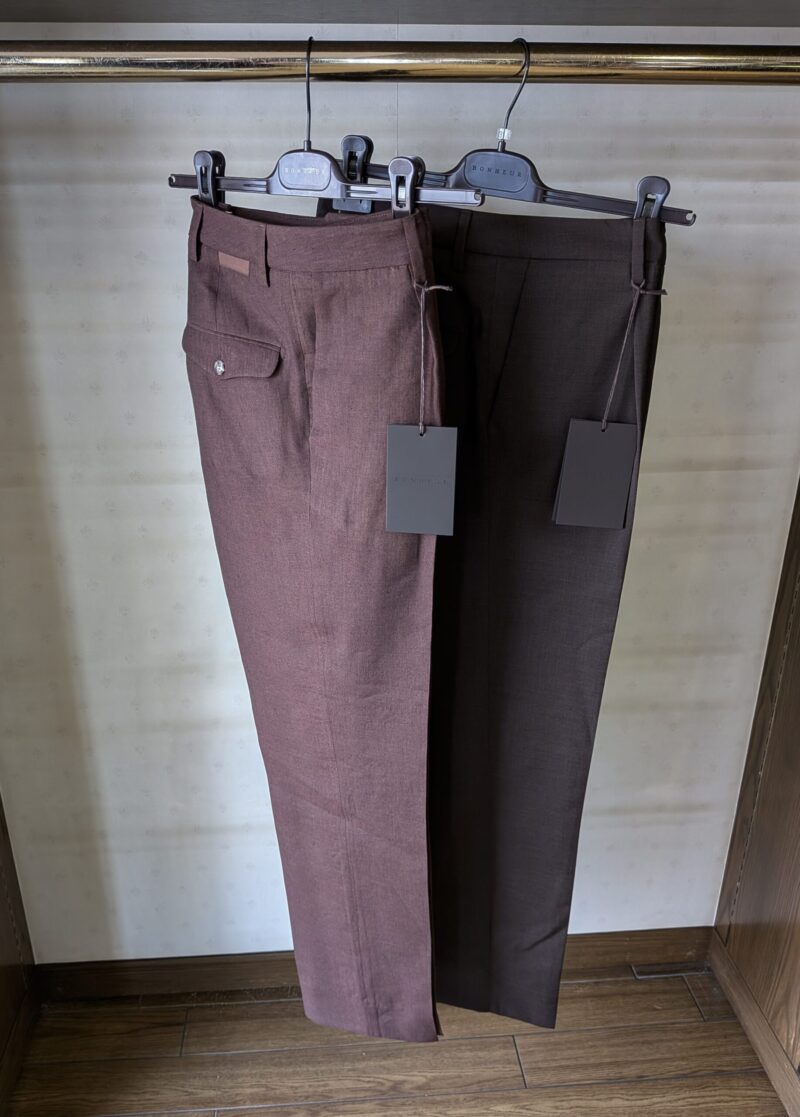 すでに、昨年、何本か色違いでお持ちの方々に好評だったのが、ニューモデルの「Violina」。ドレス寄りのエレガントなシルエットです。リネンとウールでセレクト。どちらも茶系で選んだのが良かったようです。