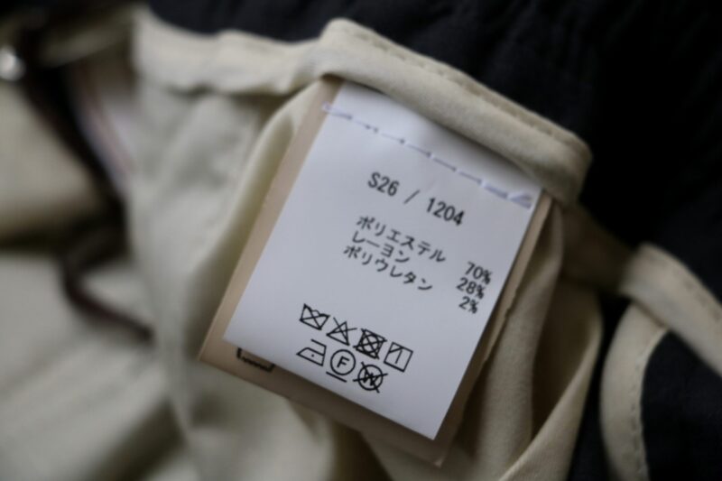 元々はウールの代替品としてできた素材(糸)なのですが、ポリエステルはウールに比べて丈夫で固いため、それを補完するためにレーヨンを混ぜることで柔らかさを出しています。柔らかさと、丈夫さを良いとこどりした素材と言えます。ポリウレタンを入れることで伸縮性にも優れ、イージケアも魅力の一つになるでしょう。