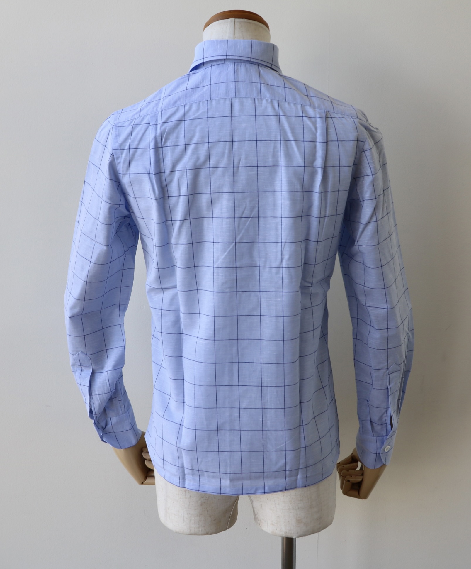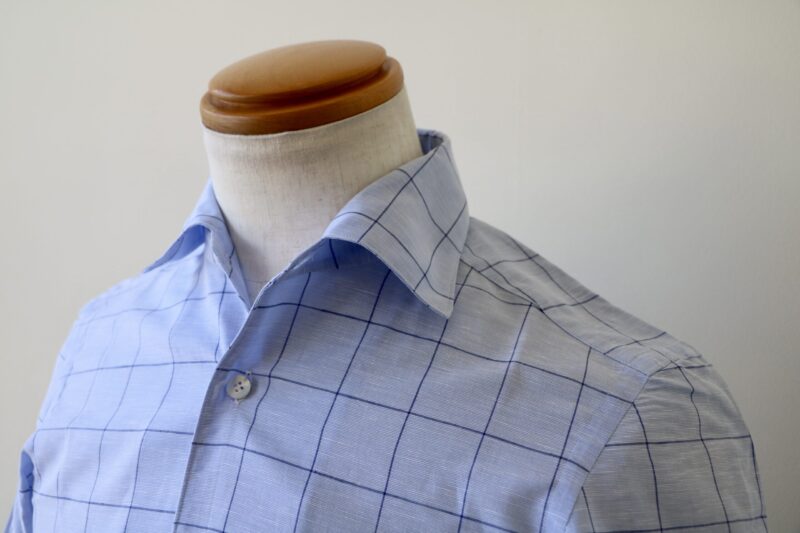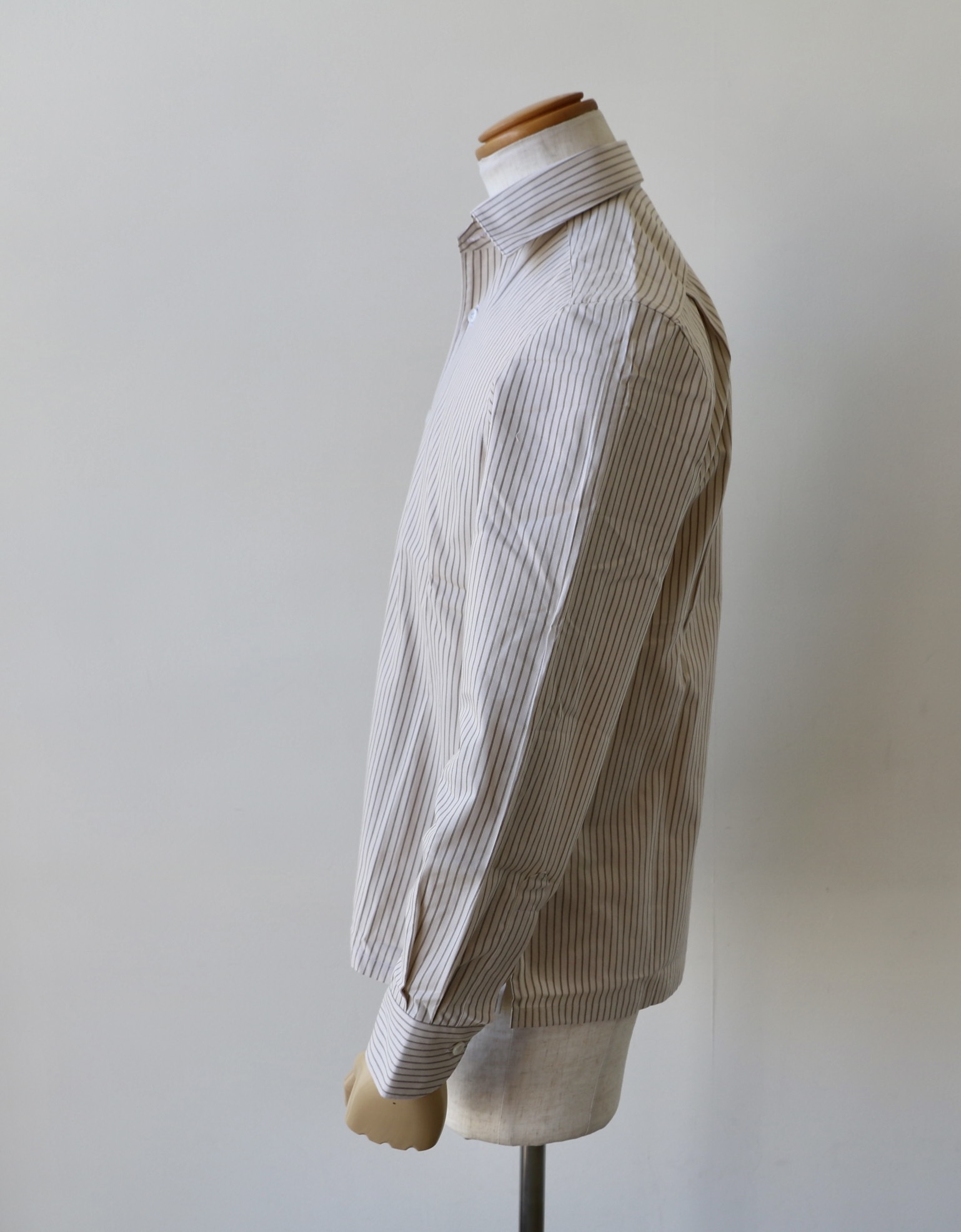 背はサイドプリーツ。カフスは大丸。裾にはスリットが入ります。どの角度から見ても美しいシャツです。姿勢が良ければさらに‥でしょうか。