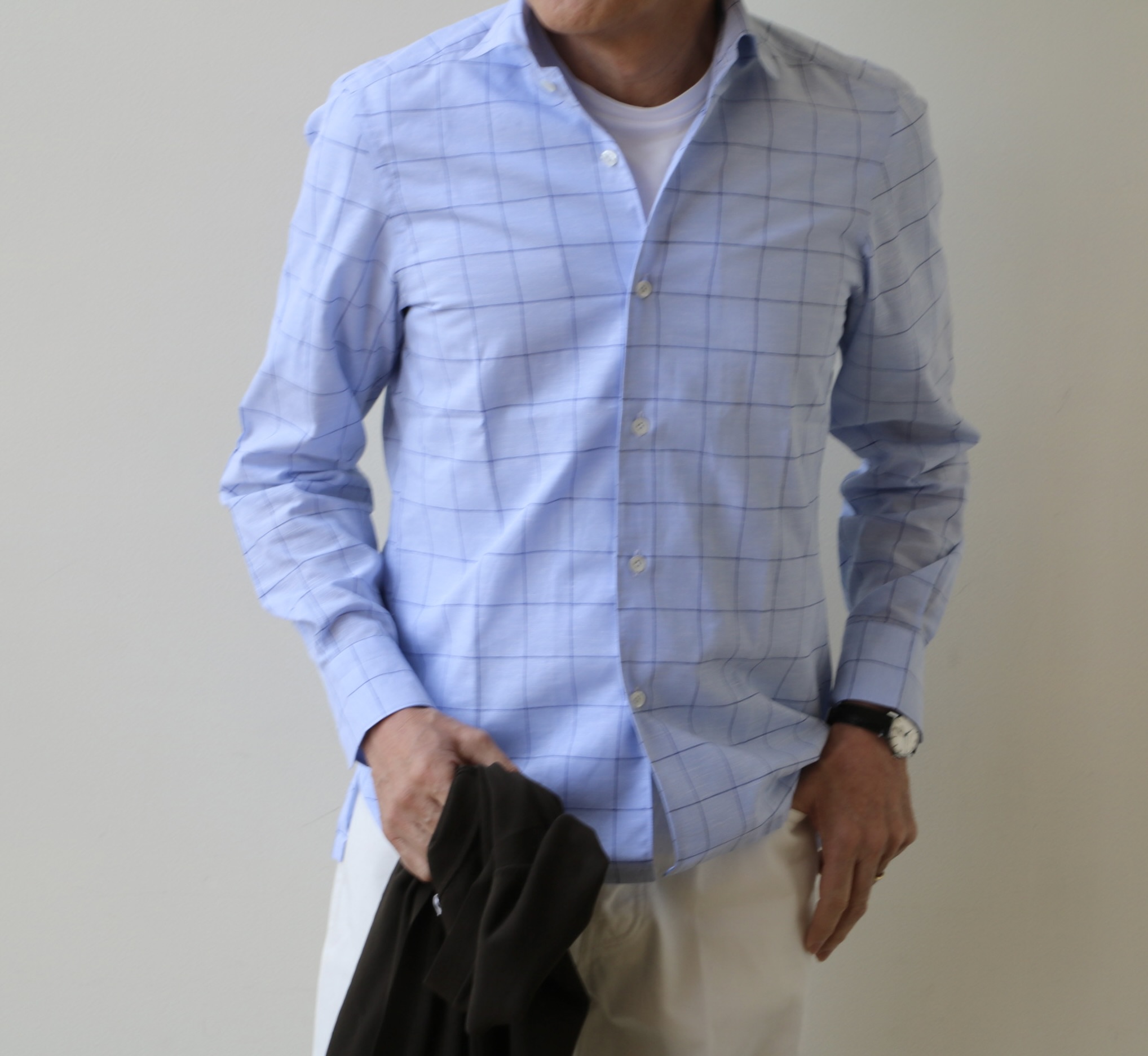 汚れ防止のためにインにアンダーを着ていますが、素肌に着ても気持ち良いシャツです。体型や選ぶサイズにもよりますが、タックイン、アウトのどちらにも活用できるシャツです。