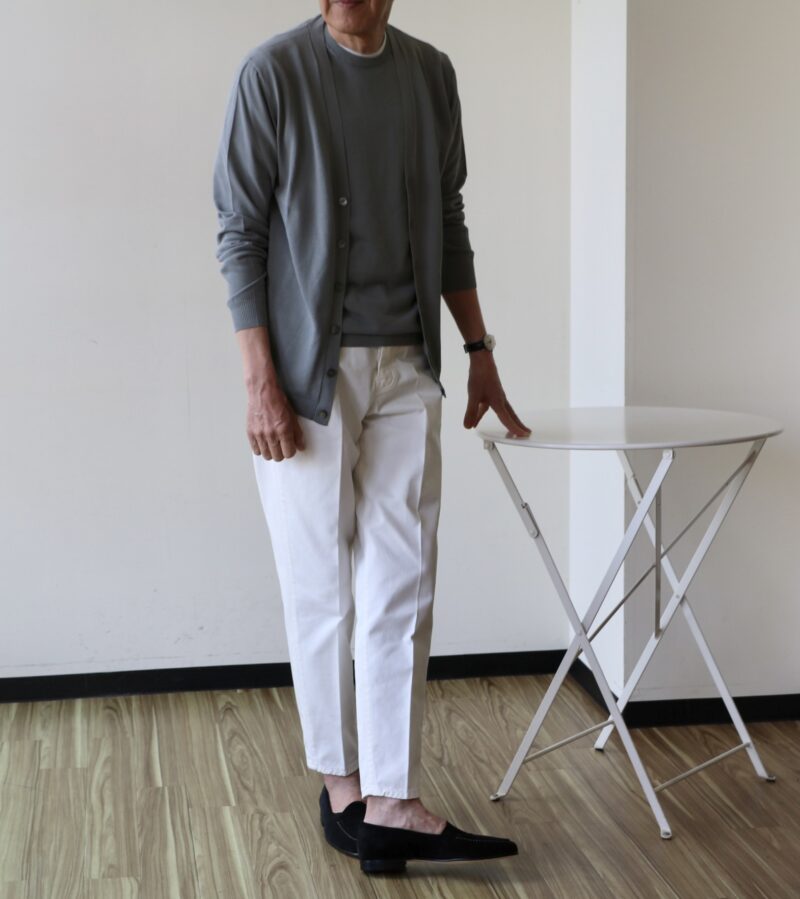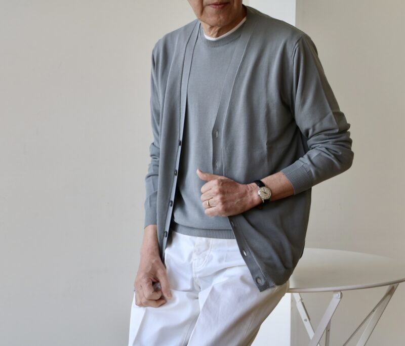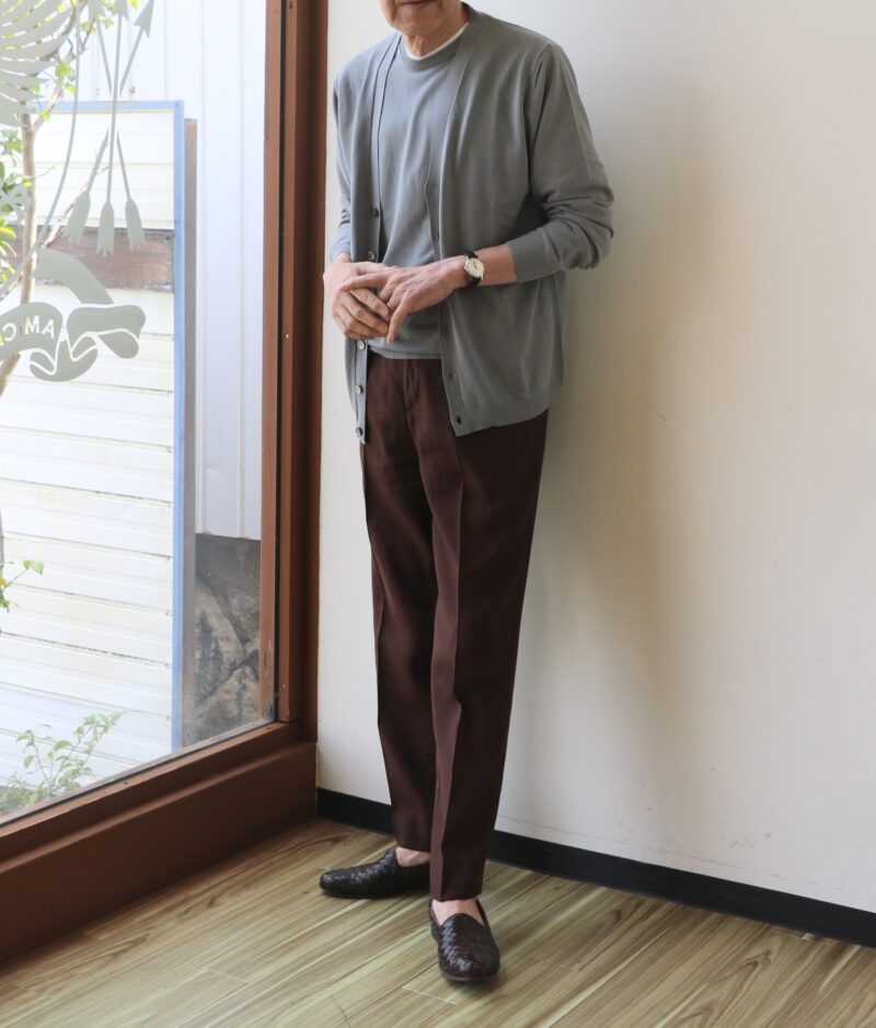 このフォッグには共地のカーディガン(32.000円)をご用意し、ツインニットで楽しんでいただけます。