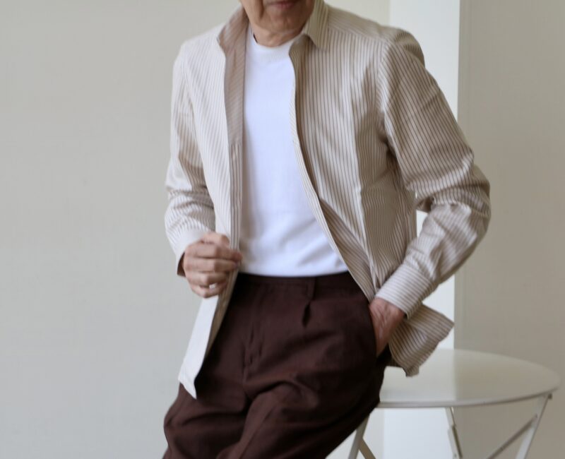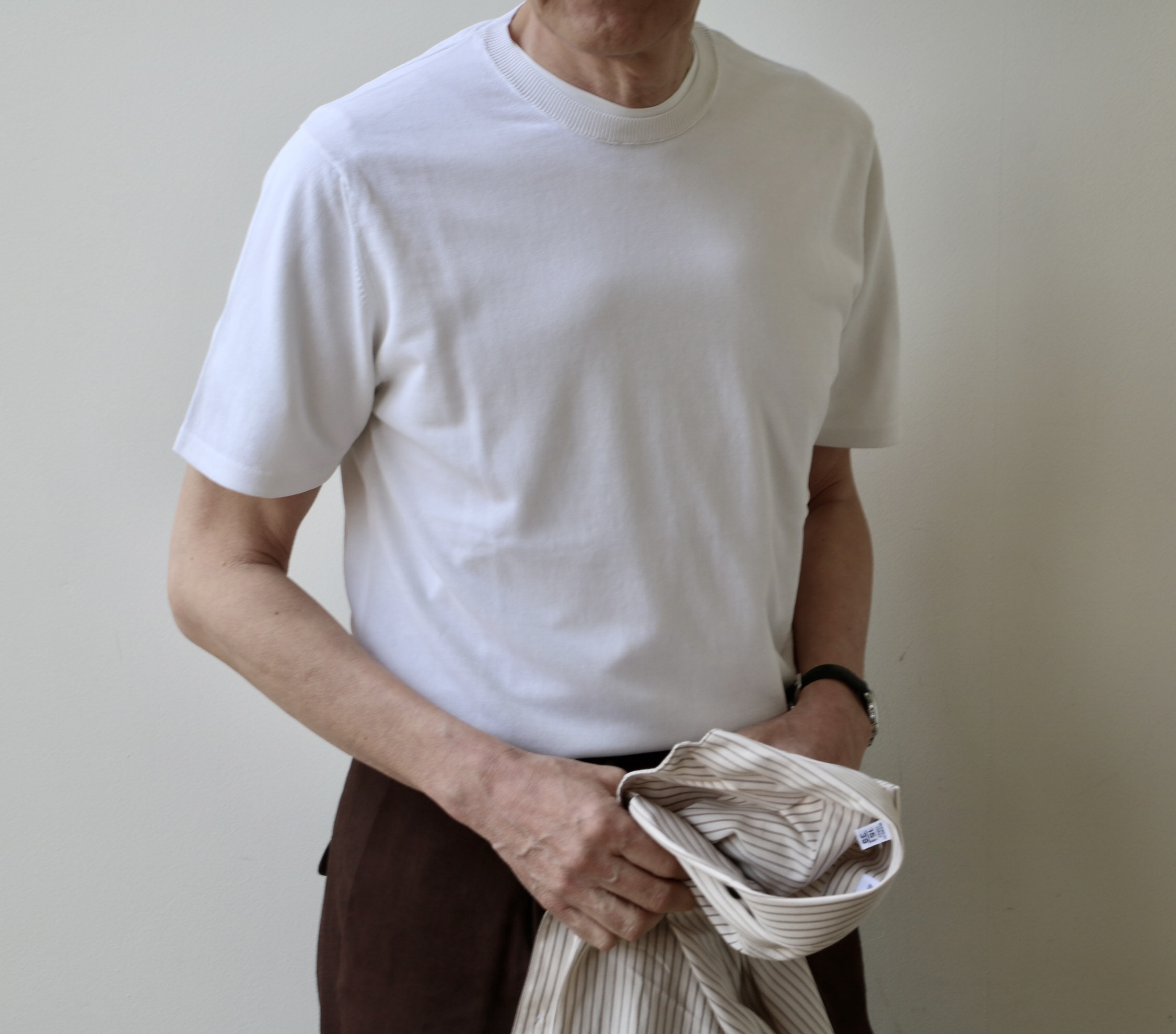 一昨日ご紹介のErrico Formicola/エリコ フォルミコラ「LECCE」オックスフォード ストライプ柄シャツ。早速、お便りをいただきました。ありがとうございます。インに合わせたのが、このニットです。柔らかく不透明なミルキーホワイト。カットソーTシャツに比べ、優しげでナチュラル。上品な雰囲気です。