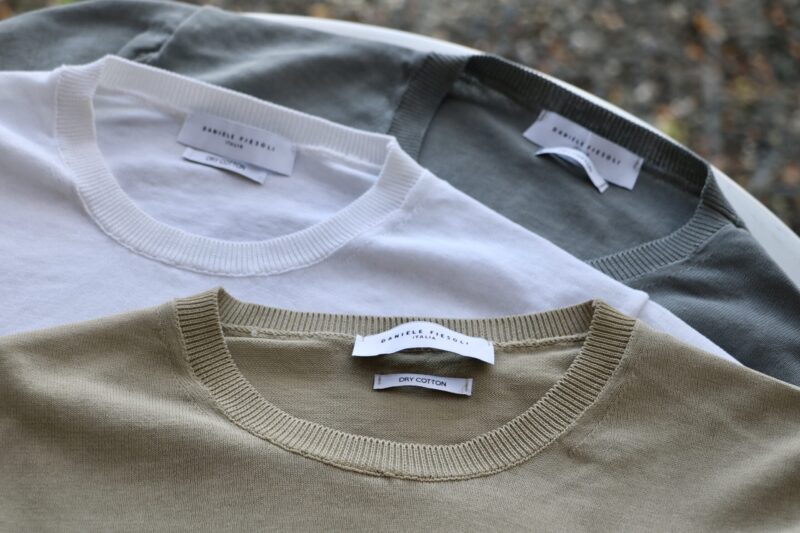 今年は特に気温差を感じる春です。空調を休めさせたい季節ですが、夕方になって肌寒く、こんな時、あのベストがあればなと思いつつ、ついに暖房を入れてしまいました。そんな中、本日ご紹介させていただくのは、ドライなアイテムです。【DANIELE FIESOLI/ダニエル・フィエゾーリ】の「DRY COTTON」ショートスリーブのクルーネックサマーニットをご覧ください。