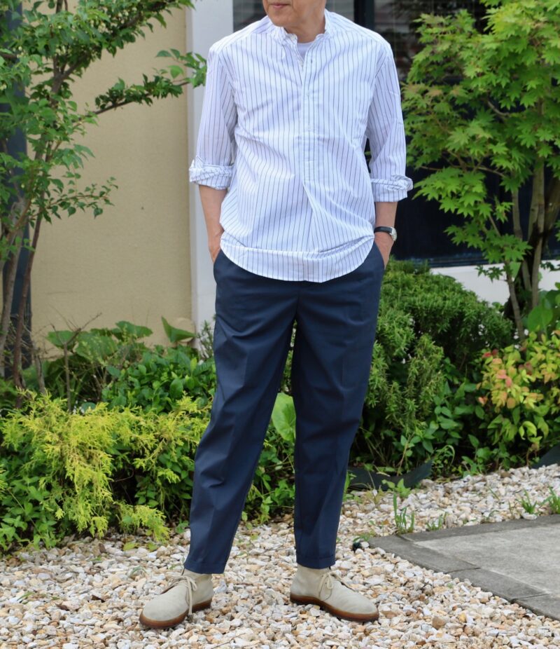 本日、ご紹介させていただくのは、コットン・ポリのストレッチパンツ。昔風でいえば、コッパン。軽快な穿き心地のカジュアルパンツです。カーキベージュとネイビーの基本色でご提案します。