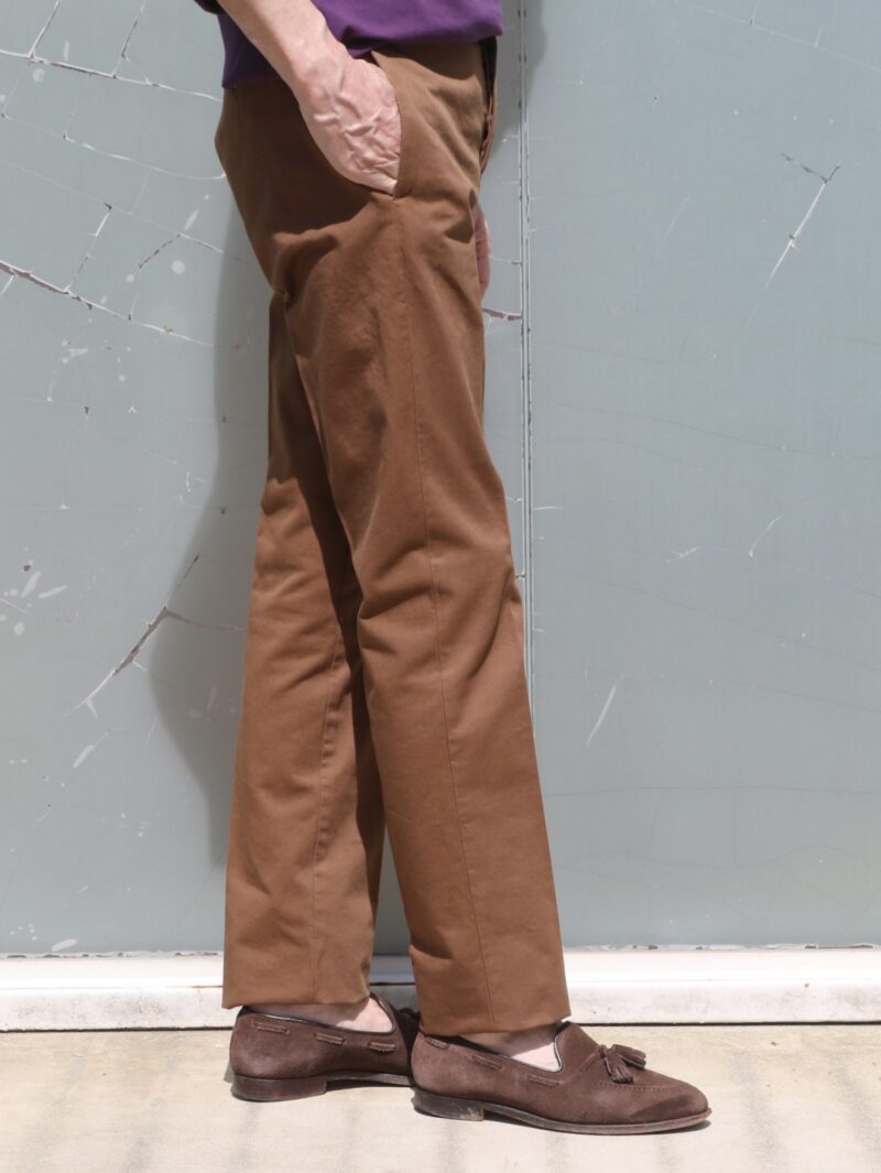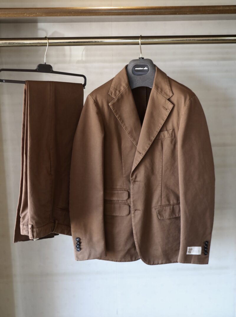表地はウエイトのあるコットンギャバ。適度なハリと綾織り特有のしなやかな風合いです。服好きの方にはたまらない生地感ですが、そうでない方にとっては少し重く感じるかもしれません。真夏と真冬以外に来ていただけるスーツです。もちろん、単品使いもできますが、ジャケットは別として、負荷のかかるパンツはできるだけスーツとしての着用をお勧めします。