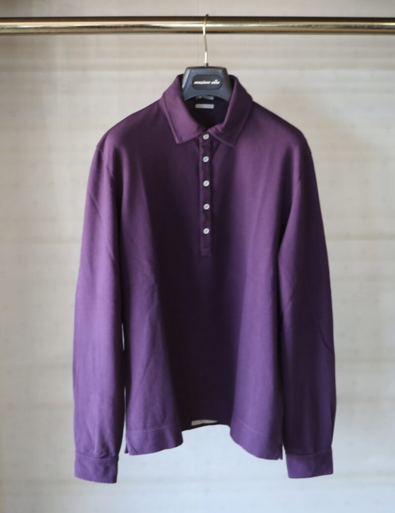 鹿の子織の台襟付きのプルオーバーシャツです。特徴はボタンの数。一、二、三、シー、五個でした。スポーティーでありながら、エレガントな佇まいです。