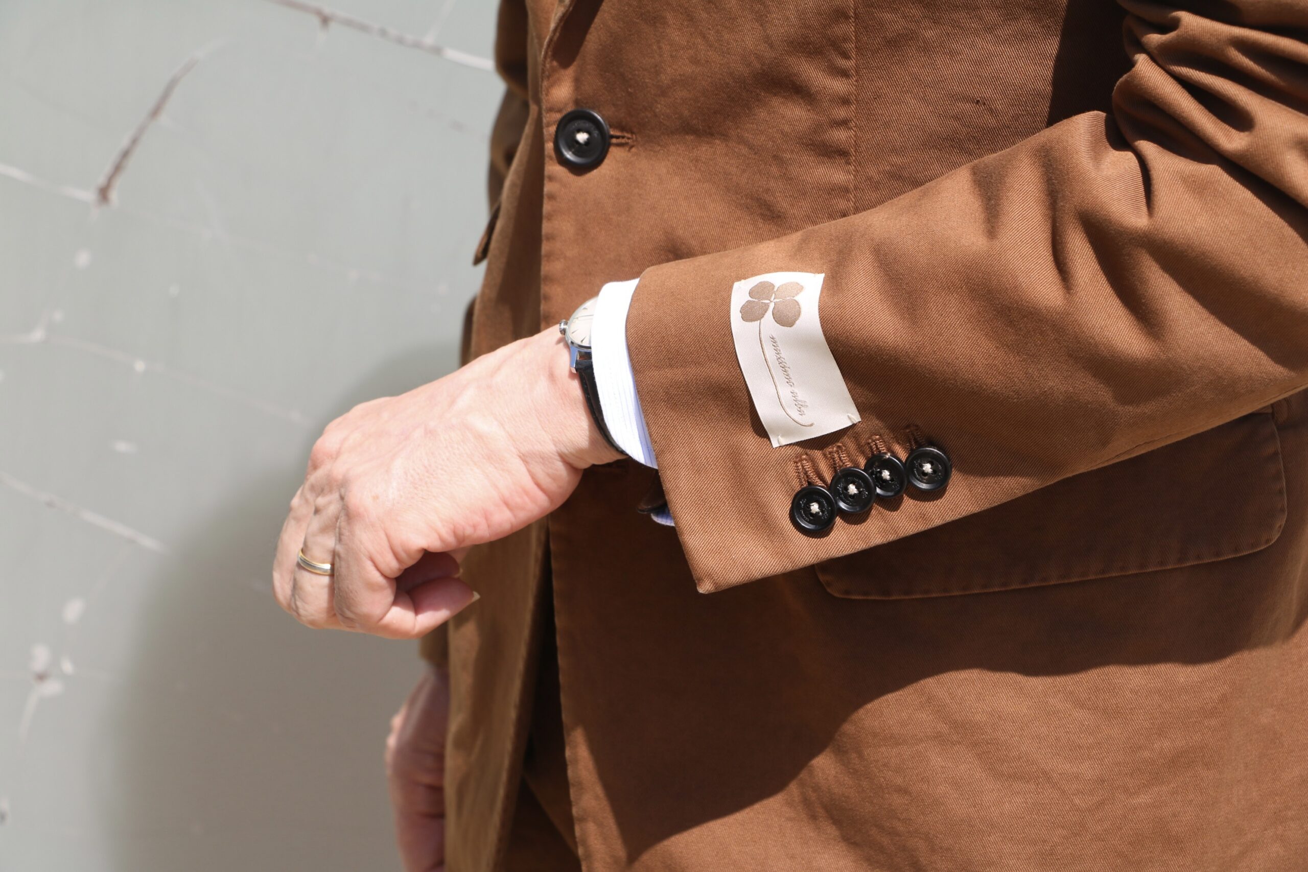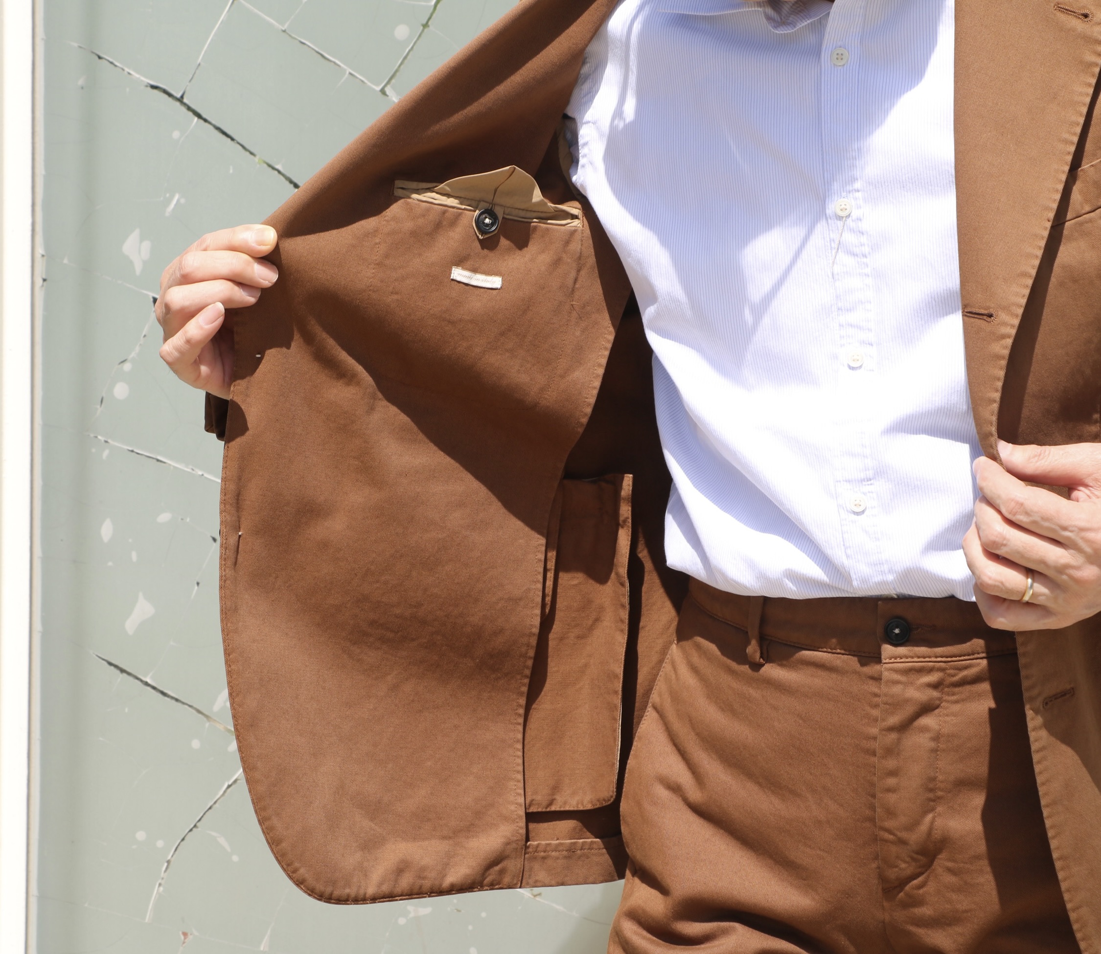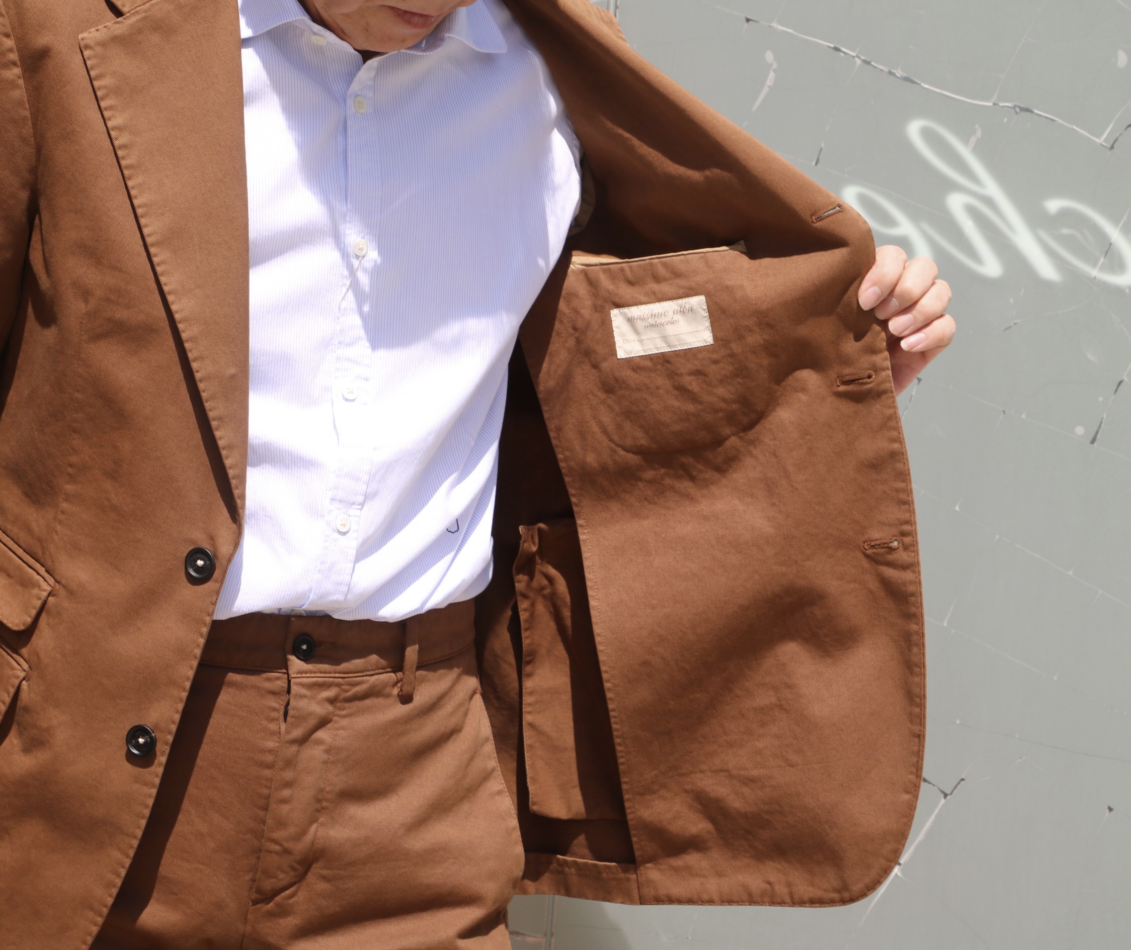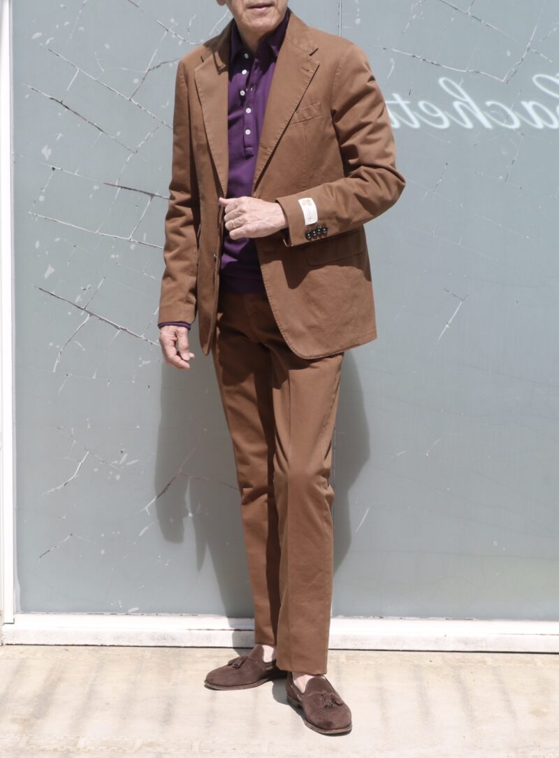 開店前のカシェートテラス。春というより、すでに初夏の日差しの中、店内で見るより艶やかな黄褐色(シエナブラウン)のスーツです。カットソーとシャツ合わせの2パターンご用意。ネクタイと靴以外は【massimo alba/マッシモ・アルバ】です。