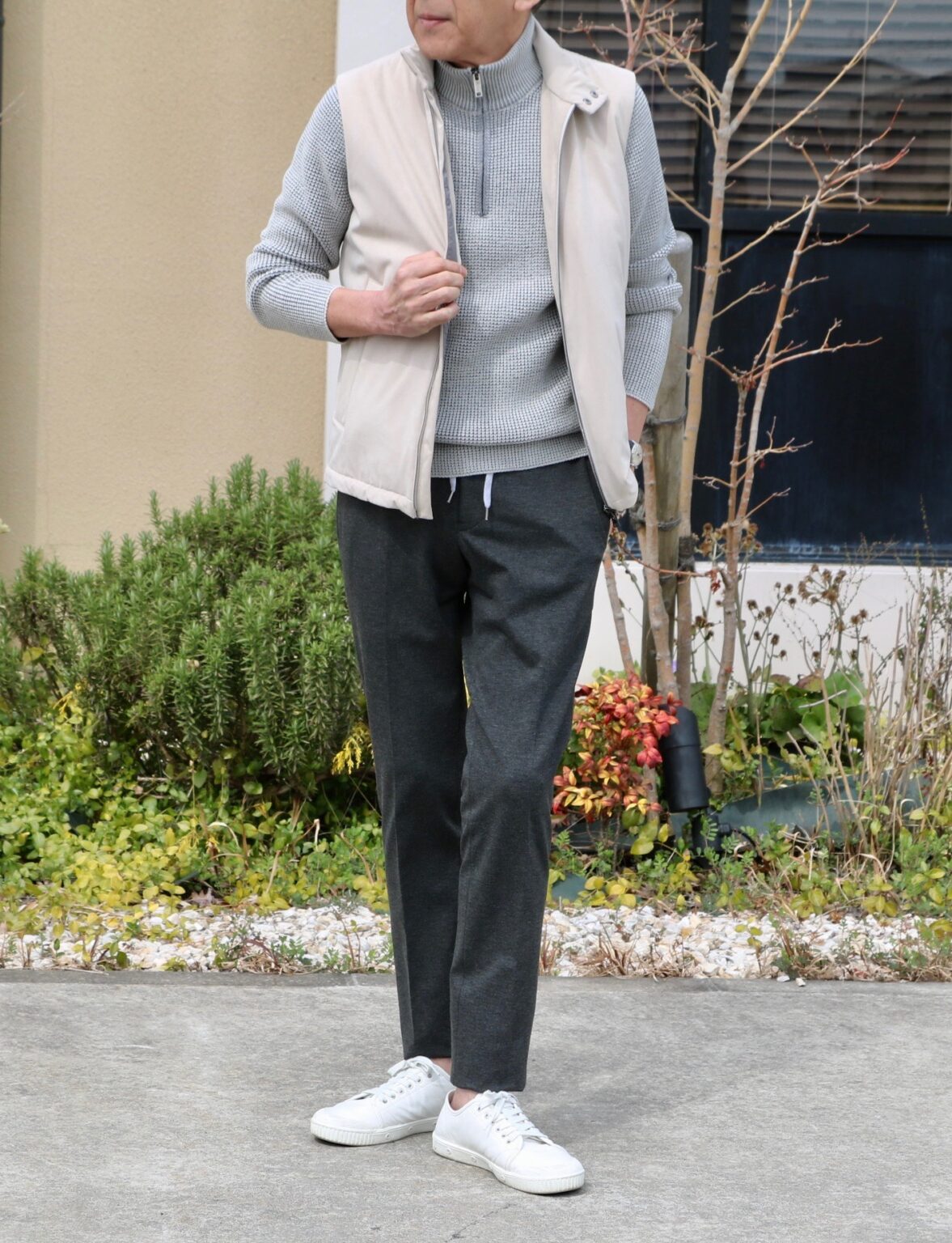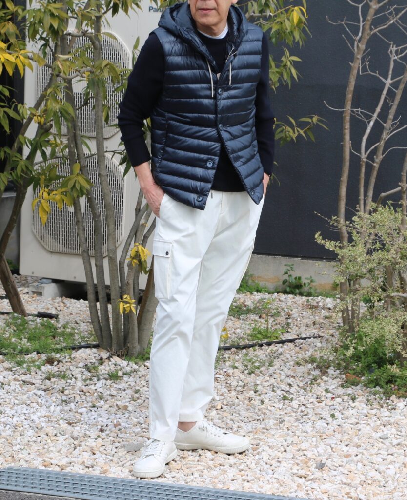インのモックネックはDrumohr/ドルモア。ボトムはPT TORINO/ピーティートリノのコットンパンツ。オフホワイトのサイズ46を穿いております。