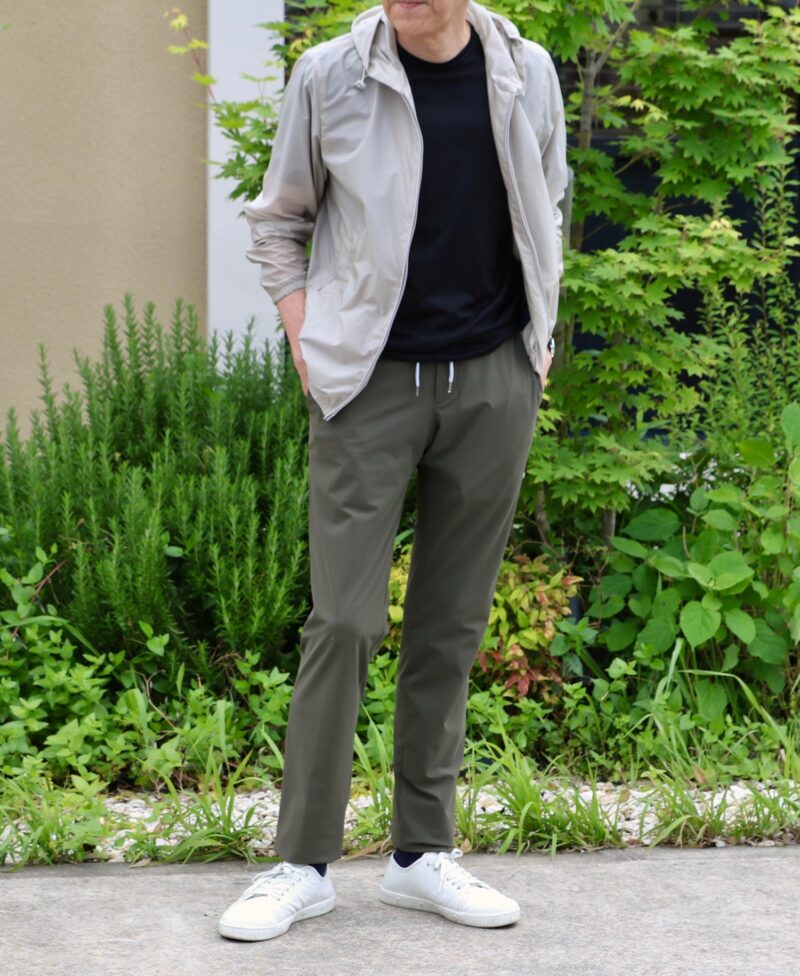 サイズSを着用。フィットは「EASY FIT」なので、ややゆとりを持たせたリラックス感あるシルエット。着丈はやや短めです。ボトムはGTA/ジーティーアーの「LUCA」コットンストレッチパンツ。例の楽チンパンツです。個人的にはカーキの46を購入。オリーブの44を穿いてみましたが、ややタイトでした。