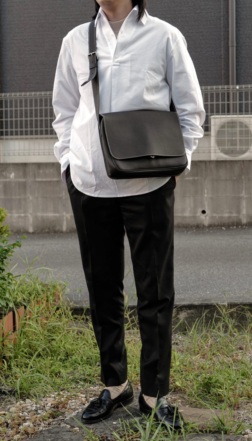 パンツは先にご案内させていただいたインコテックス スラックス。手に持った鞄はCISEI/シセイ(未公開)となります。