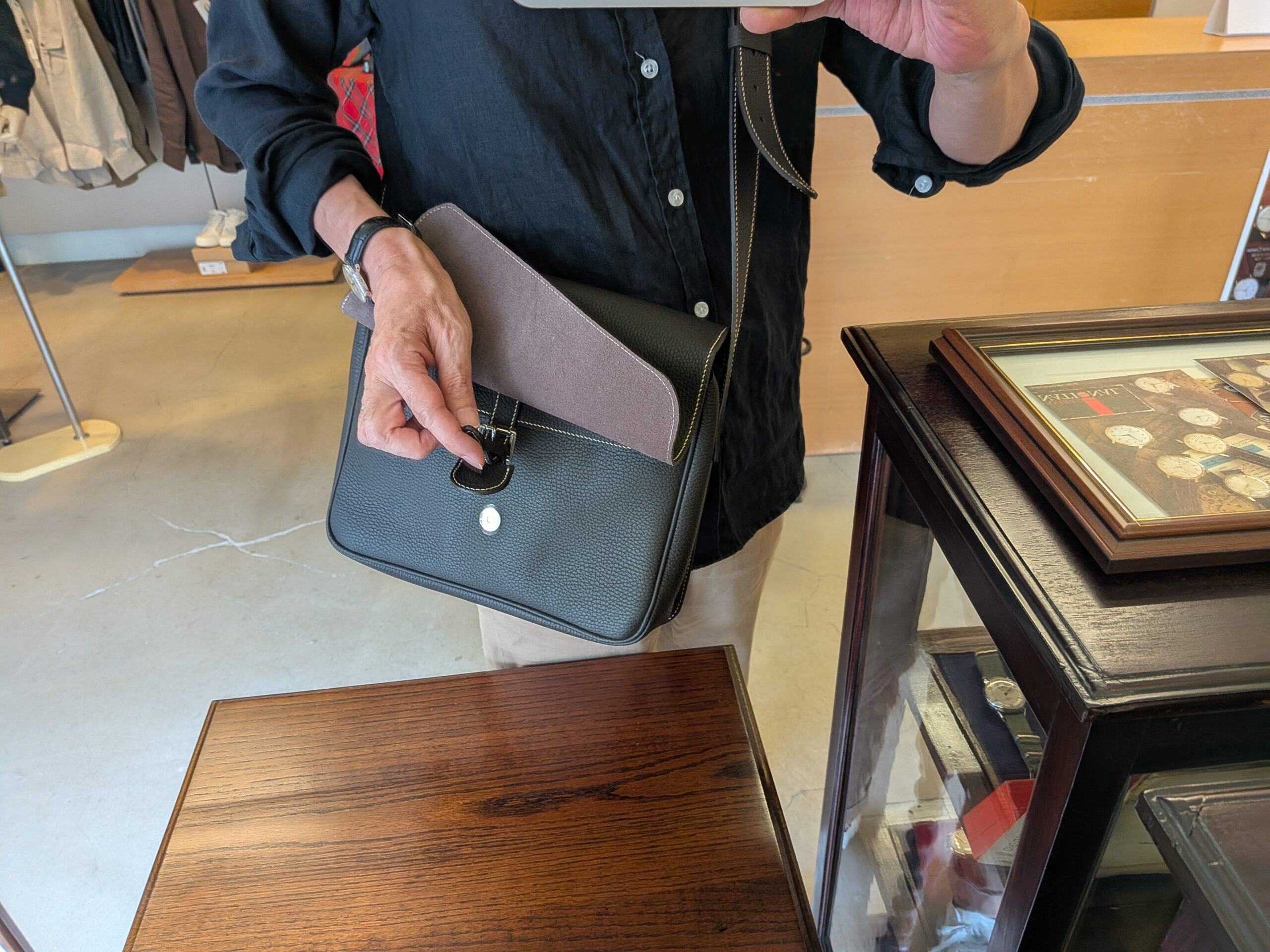 写真撮影の際、「掲載するまで載せないで」の声がかかったのは【Charles et Charlus/シャルル・エ・シャルリュス】の「MINETTI」グレインレザーショルダーバック。