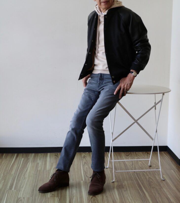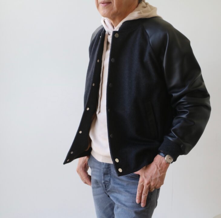 新着CINQUANTA/チンクアンタのアワードジャケット。合わせたトップスはカシェート、ボトムはグローリーガイお勧めのセール品です。