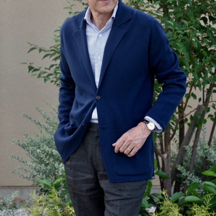 私スグルシニアは、リネンシャツにサイズSを羽織ってみました。着用前のイメージとして、かつて展開していたラルディーニのニットジャケットを思い出させますが、着心地は異なります。まずは軽さ。24ゲージのハイゲージならではのしなやかで軽快な羽織心地です。また身体のラインを強調するようなシルエットではなく、身体との程よい距離を保ちながらもすっきりと見せる、そんなフォルムです。選んだ色はブラック。ただ、撮影後、HEMINGWAY BLUE/ヘミングウェイブルーで撮ればよかったと思うほど、素敵な色でした。カシェートが休みの間、こそっと撮り直してみるつもりです。