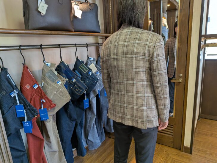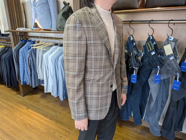 ブルーのグラデーションで魅せるウィンドウペン柄ジャケットは、ウール・シルクのストレッチ素材。イタリア人好みの柄行きです。サイズ46で同じく彼に羽織ってもらいました。ややタイトですが、柔らかで立体的な作りです。さほど違和感はありませんが、やはりワンサイズ上になるでしょうね。
