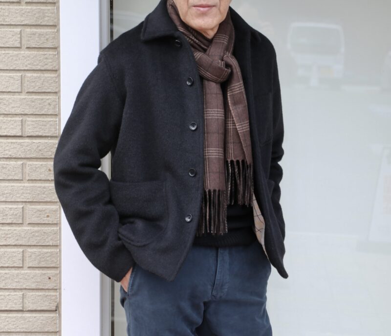 INVERTERE/インバーティアといえば、Joshua Ellis製ウールヘリンボーン織りカーコート。撮影の為、グローリーガイに置いてあった際に羽織られたH様。一旦は保留になりましたが、気温が下がったこともあり、ご購入を決意。カシェートにご来店いただきました。ただ、選ばれたのは、ネイビー。そうなると、ブラウンのサイズ38が残り1着。悩ましい年末です。