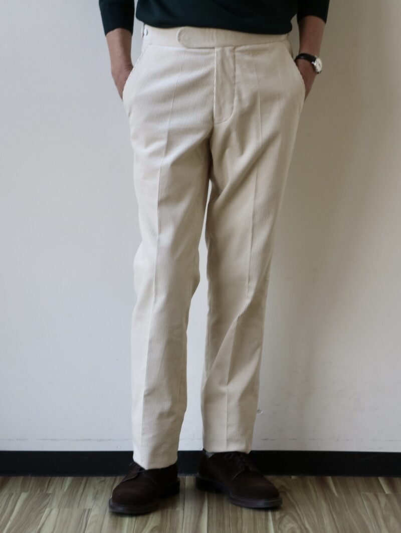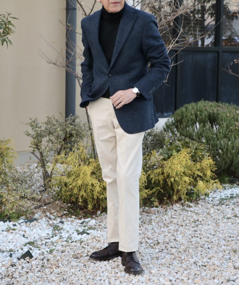 カシェートブログではスーツでご提案していましたので、ジャケット単品のコーディネートでご覧ください。着用サイズは36になります。インに合わせたのは、Drumohr/ドルモアのブラックタートル、ボトムはCORDINGS/コーディングスのコーデュロイ。オフホワイトを穿いてみました。