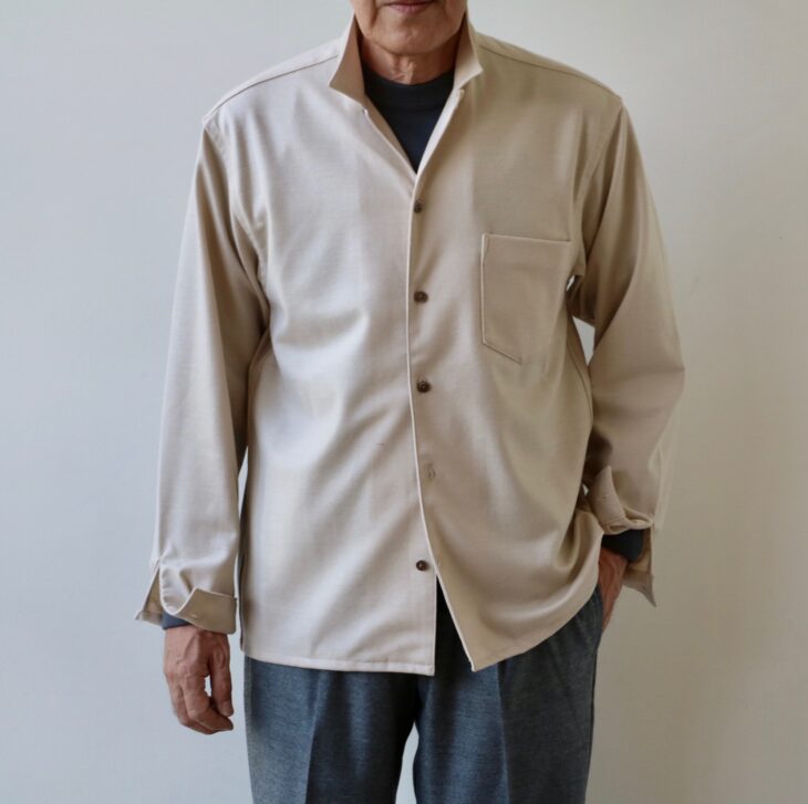 頑張って着替えてみました。頑張るほどではなく、ウールのクルーネック(未公開のSUNSPEL)を合わせただけです。フロントを開けて着ても形が崩れない台襟付きの襟。フロントボタンを閉めた際と襟の位置が変わらないのも特徴であり、特筆すべき魅力です。