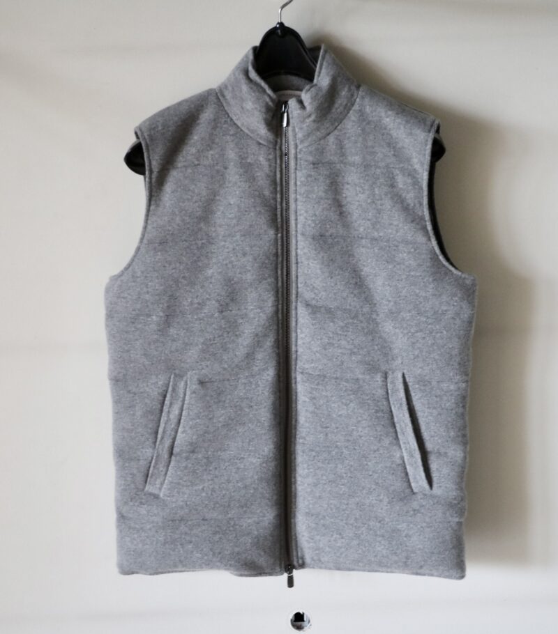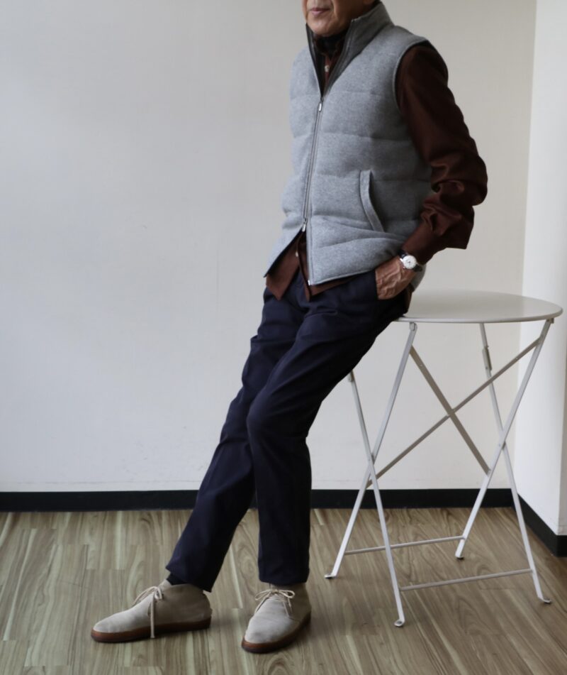 シャツアウターにさらりと、室内でも大げさになることのないカシミア100%のダウンベストです。冬の中間アイテムとしていかがでしょう。