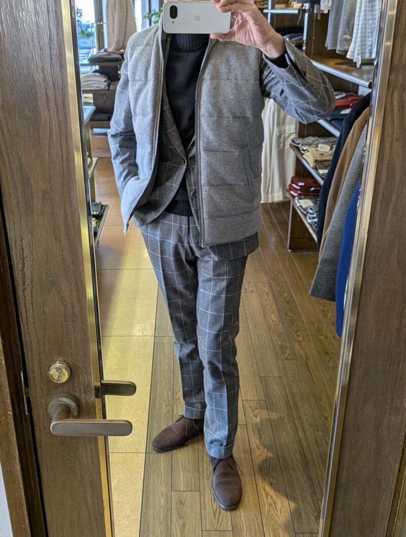 車での移動。駐車場から店も近く、ほとんど歩きません。一応、ウールコートは持ってきていますが、使うかどうかです。スーツだけでは寒い。かといってコートまでは、そんな時に便利なのが、このカシミアのダウンベストです。