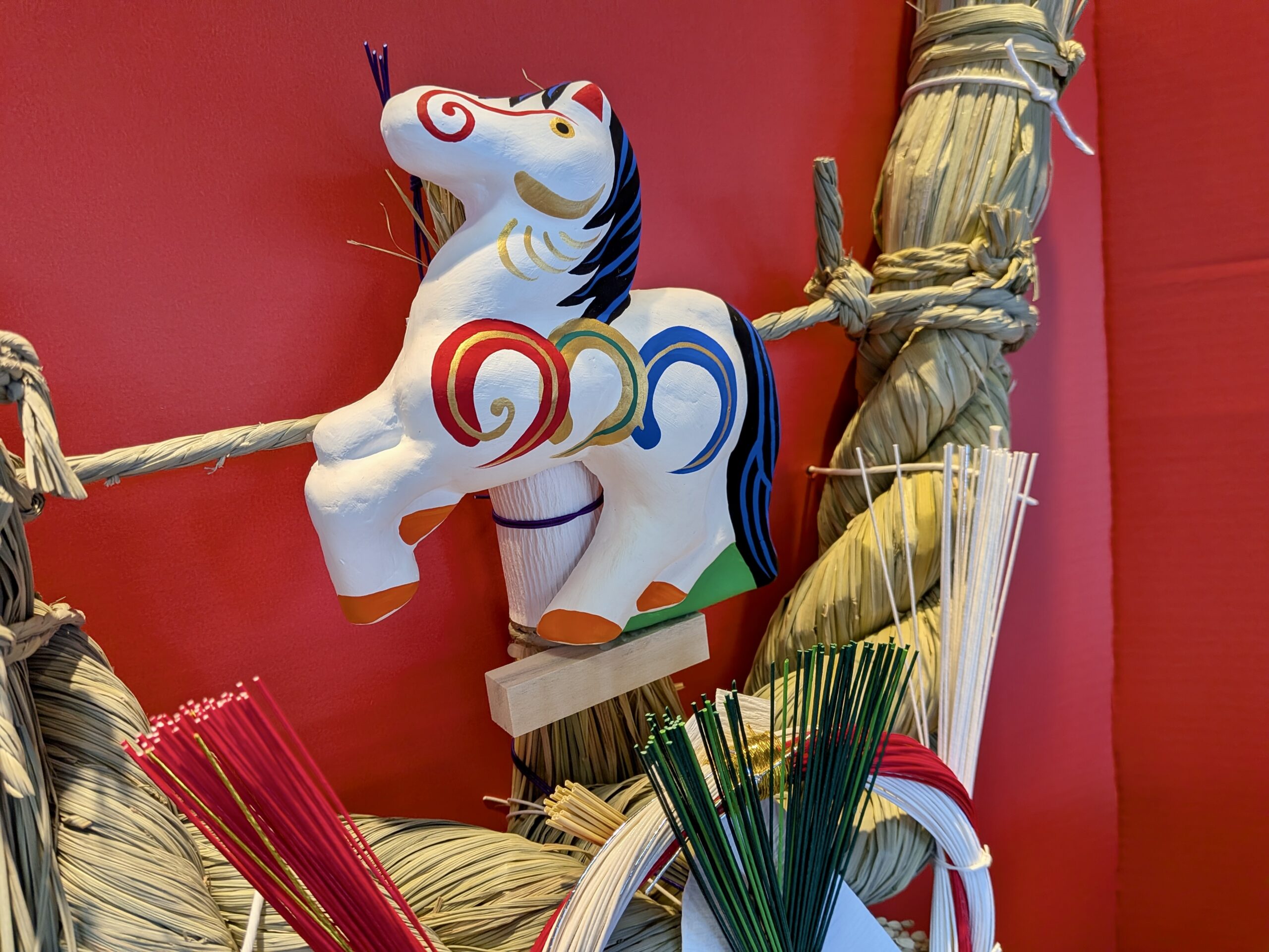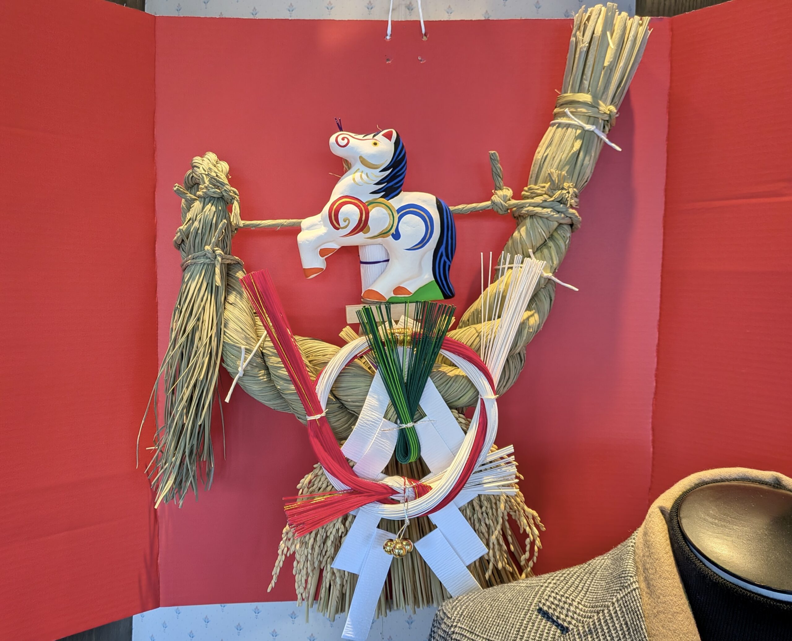 入り口正面に飾る恒例のえと縄。令和8年の干支は「午(うま)」です。