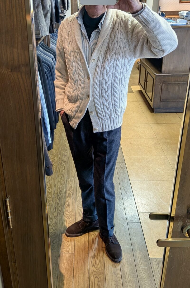 一年の締めくくりです。やはり自慢の服を着て売り場に立ちます。ハイゲージのニットにオックスフォードのシャツ。ボトムはホームスパンに靴はスエードブラウンのプレーントゥ。羽織ったのが、クリスマスにカシェートよりプレゼントされた【Corgi/コーギー】のショールカラーカーディガン。ご紹介前にいただいてしまって良いのかどうか。私の着用サイズはS。他にMとLがご用意してあります。お揃いで温もりたい方がございましたら、ぜひカシェートに。必ずや一生モノのニットになるはずです。多分、年明け1月3日の初売りにも同じスタイルで登場するかと思います。