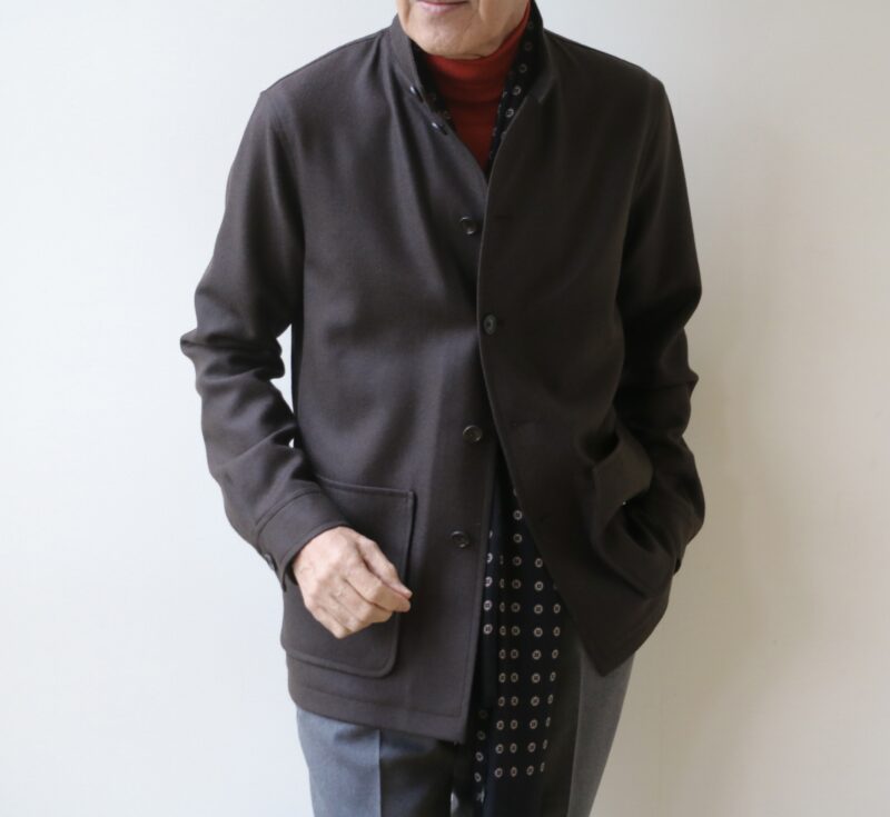 フレンチシックなスタンドカラージャケットはニューモデルの「G-KLEIN」。自由人を気取った遊び心のあるブラウンをセレクトです。