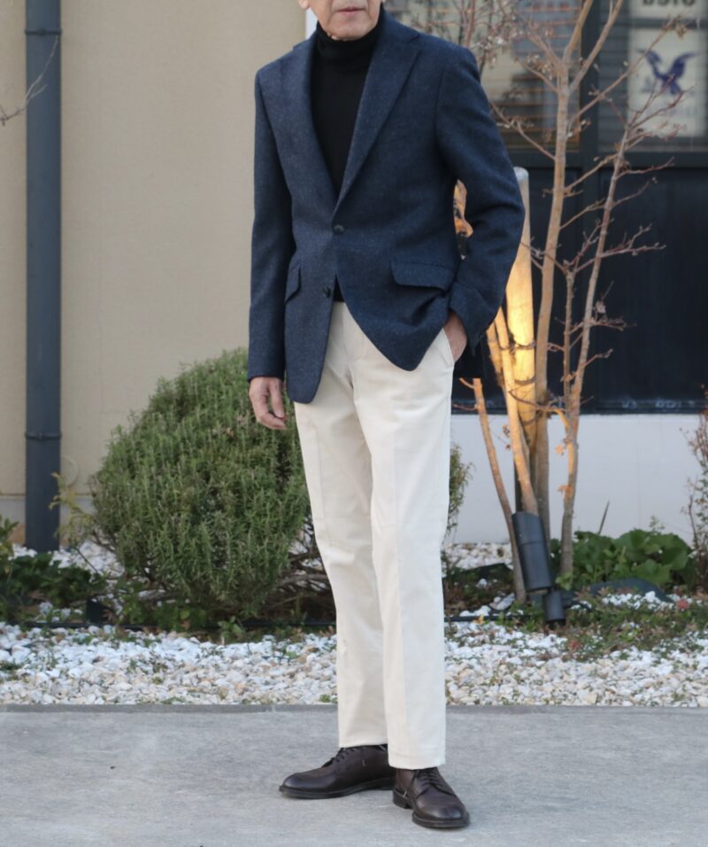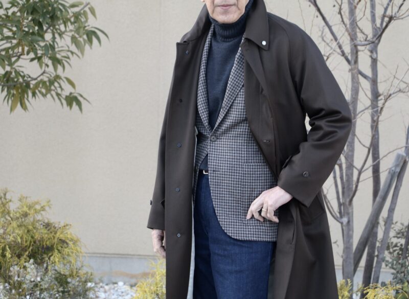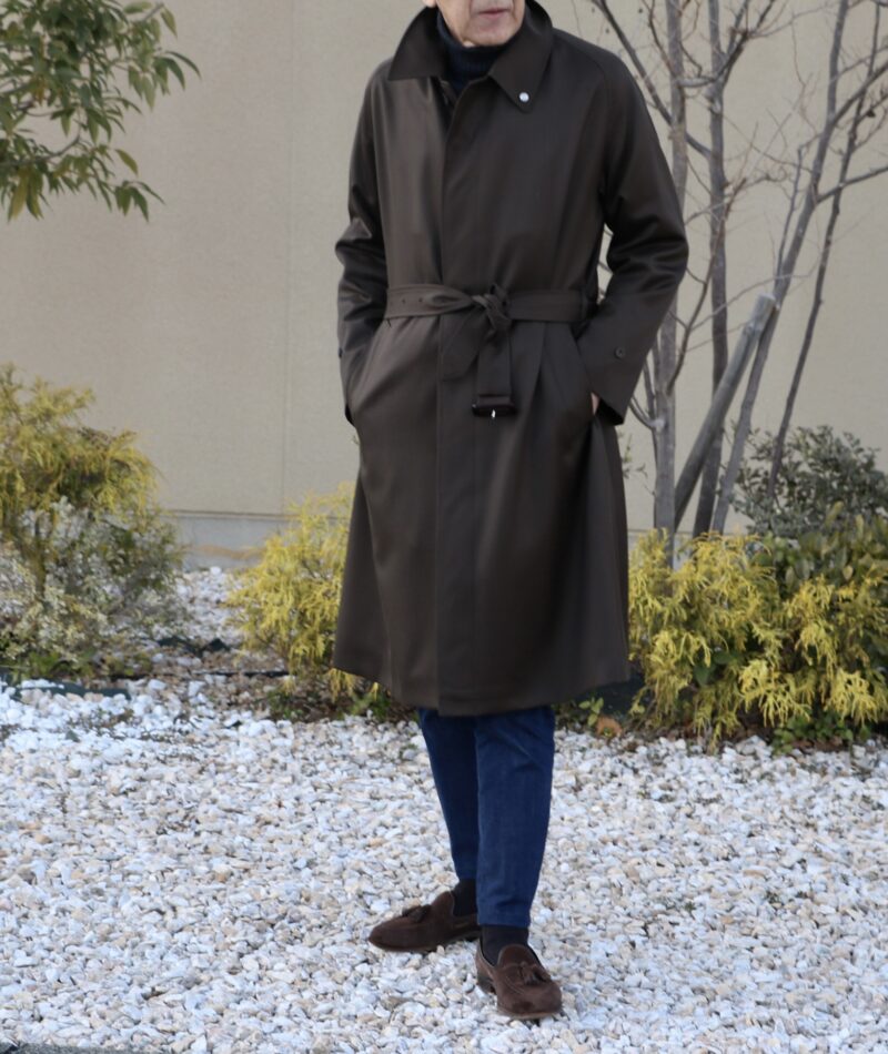 ジャケットはCARUSO/カルーゾ(ス・ミズラー)、ニットはDrumohr/ドルモア、パンツはBERNARD ZINS/ベルナールザンスとコート以外は私物です。合わせたコートが、こちらもWhiteley&Green/ホワイトリーアンドグリーン。昨年よりカシェート展開している注目のアウター、コートブランドです。元々は乗馬用ウェアーに重宝され有名になった キャバリーツイル の生産から始まり、当時スペシャリストとして、ラグジュアリーブランドに認められるコレクションを数々生み出し、世界に名を馳せた英国を代表する老舗生地メーカーです。