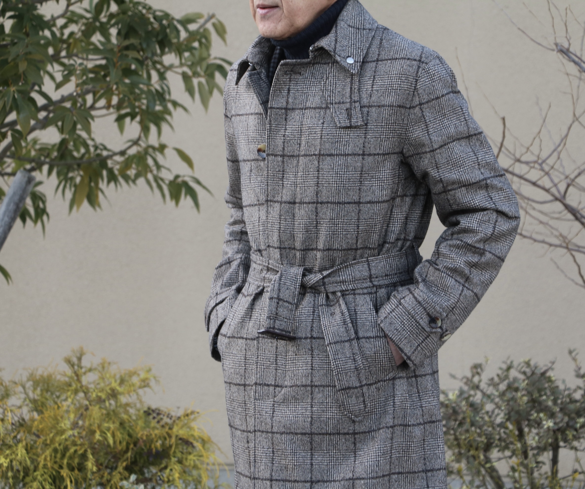 クラシックホテルに似合うコートがテーマと持ち出してきたのが、Whiteley&Green/ホワイトリーアンドグリーンのカシェート別注ファブリックオーバーペン柄ベルテッドコート。ミドル丈のシングルベルテッドモデル「Dalton」です。