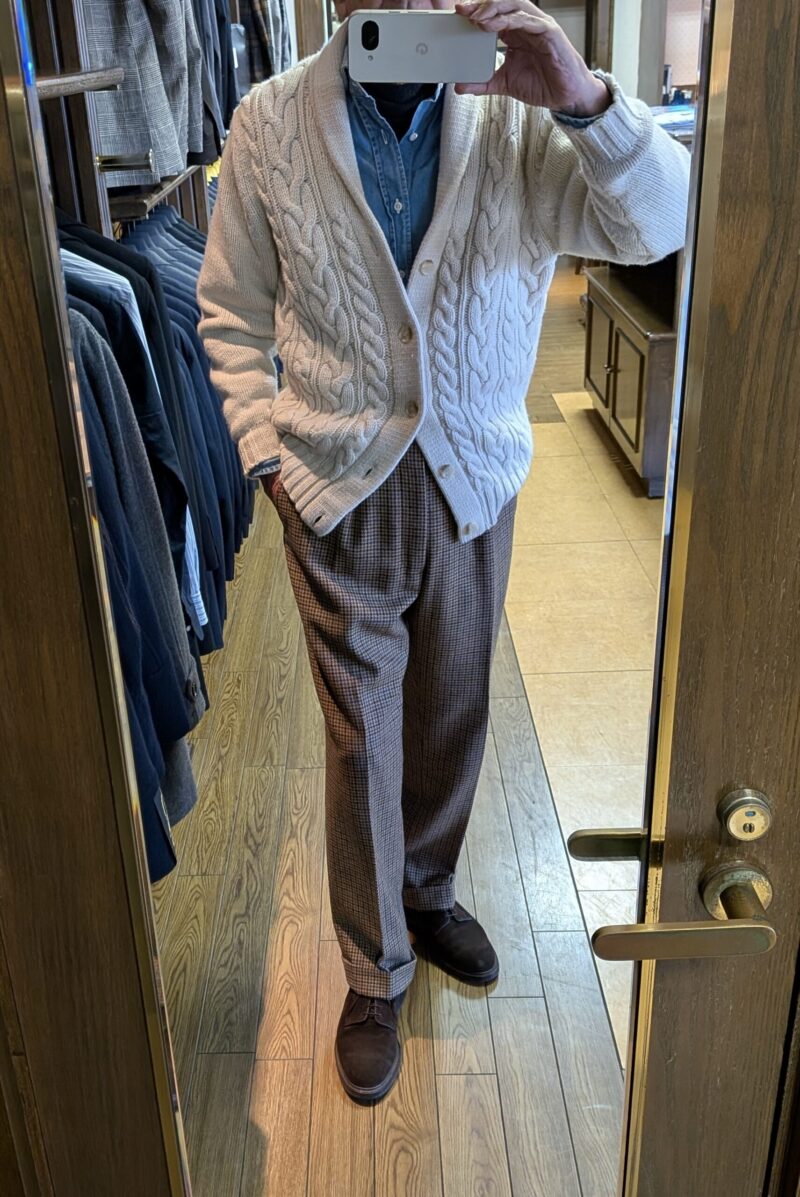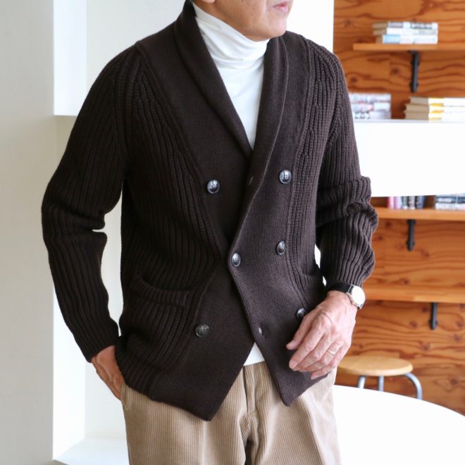 予告通り? いや、シャツとボトムが異なりますが、例のカーディガンを着てきました。初売りに着たいのは、お気に入りのアイテム。特に、寒がりな私スグルシニアにとって、この寒さに対抗できるのは英国ものでしょうか。このショールカラーのカーディガンの温かさは格別です。出たり入ったりが多いだけに、ダウン以上の防寒性と、室内で脱がなくても良いほどに温度調整してくれるライフスタイルに合ったアイテムなんです。その威力を発揮してくれるのは、Corgi/コーギーのT&D製カシミア100%。自然の恩恵をたっぷり感じさせてくれる、正月から縁起の良いアイテム。この冬一番の立役者になるのは間違いありません。