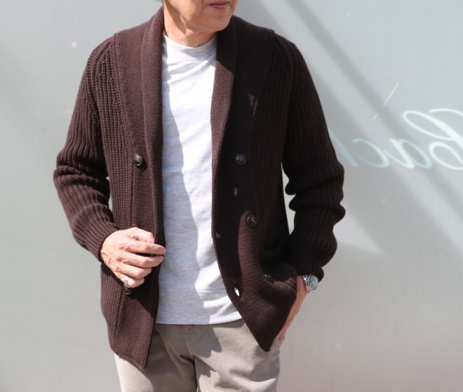 薄着でさらっと羽織るなら、こちら。Settefili Cashmere/セッテフィーリ・カシミアのダブルショールカラー ラグランカーディガン。残念がら、現在、取り扱いを休んでおりますが、お勧めのニットブランドです。サイズは限られますが、お値打ちにご提案しております。サイズが合われるようでしたら、ぜひご検討ください。