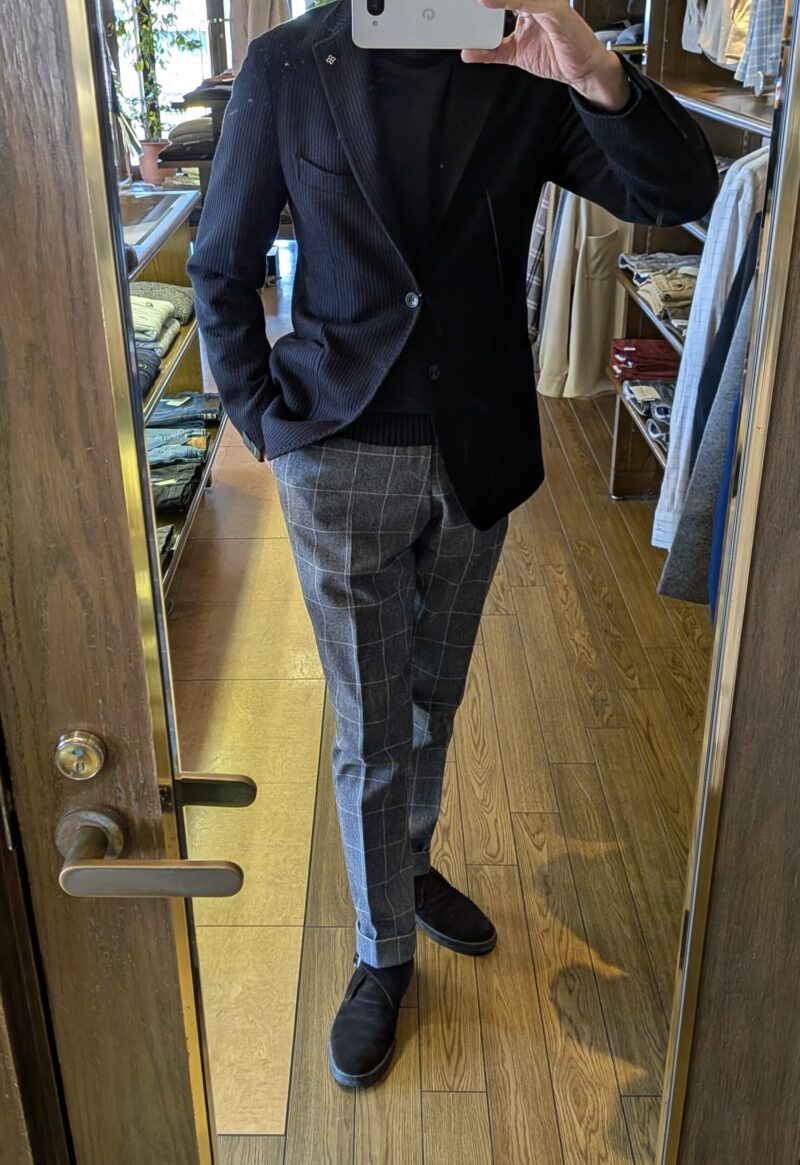グローリーガイの店頭で褒められたのは、このガンクラブチェックのトラウザース。CORDINGS/コーディングスの「GREY FOX」シリーズで他のボトムと比べるとワイドなシルエットです。20代の頃、今から40年ほど前に好んで穿いていたシルエットですので、私にとっては新鮮というより懐かしいボトムです。