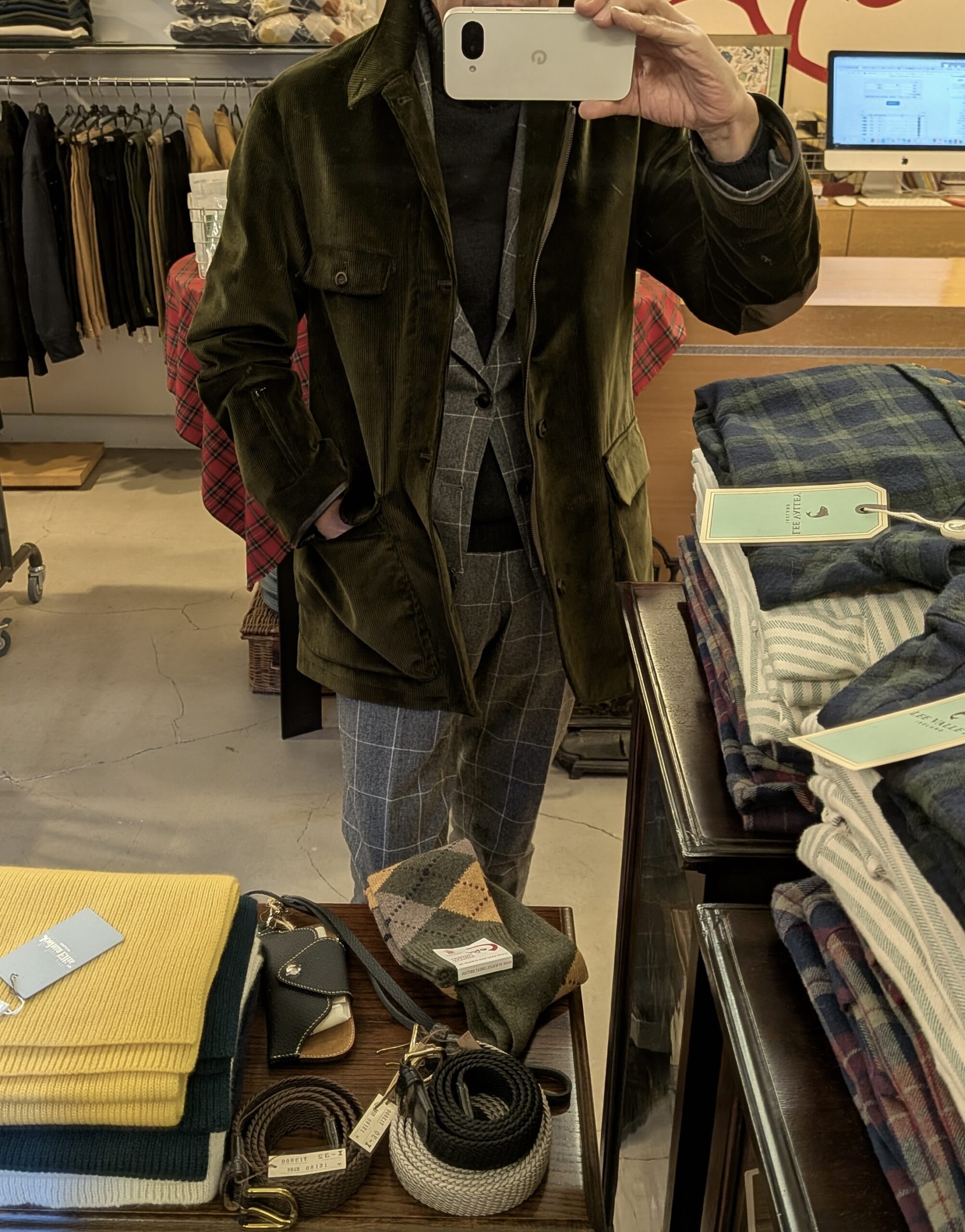 さらにまずいことが起こりました。夕方、カシェートを覗けば、CORDINGS/コーディングスにカシェート別注したグレンプレイドハリスツイードハンティングジャケットを購入された方がさらにご購入を悩まれていたのが、同ブランドのコーデュロイジャケット。幸いにもサイズSのみの展開でイタリアサイズで言えば、48相当とややオーバーサイズ。悩む必要はありません。夏はアイリッシュリネンに魅せられながらも、さほど購入リストに上がらない英国もの。寒さが厳しい今暫くは英国物欲が収まりそうにありません。