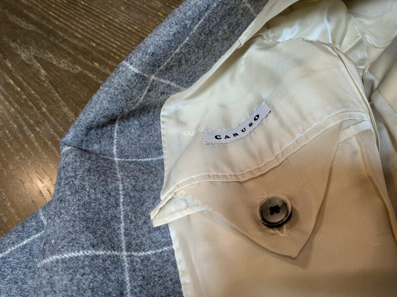 年末年始になると毎年持ち出してくるのが、CARUSO/カルーゾのグレイフランネルのウィンドウペン柄スーツ。当時、生地担当のマルコとフィッターのルカが来日した際、グローリーガイにも寄っていただくことで実現したス・ミズーライベント。まだユーロが130円台の良き時代でした。