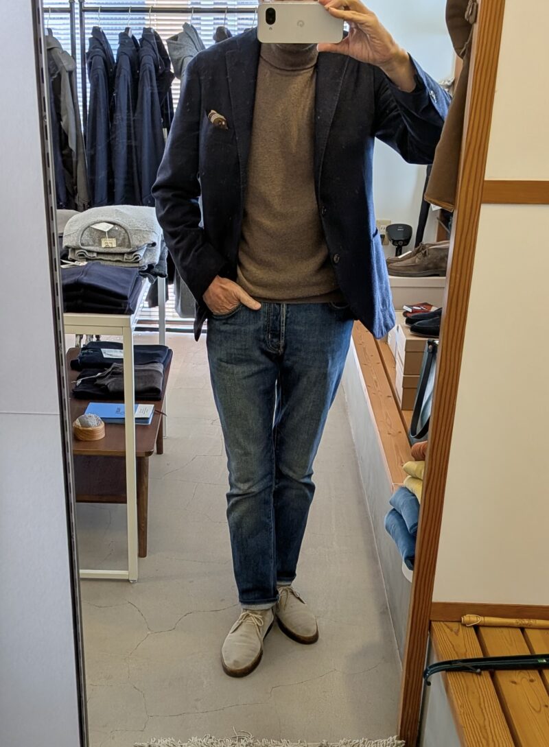 ブログ紹介ではサイズ38を、着用してご案内しております。本日、サイズ36を改めて着てみましたが、きつくはありませんでした。いや、このサイズの方がしっくりくるようです。鏡に映った姿に惚れ惚れ?暫くは脱げません。椅子に座ったり立ったり、ぐるつと回ってまた鏡の前。「いいじゃん!!」なんて日々変わる物欲。浮気者?いやいや、どれもが吟味したものばかり。特にこのブランドは私のライフスタイルブランドの一つ。当然、セレクトしたのも、私。ここ1、2年は手放したものは多いけど、手に入れたものは少ない。暫く、ライバルの動きを見て、購入しようかなといつもの販促兼ねての企みです。