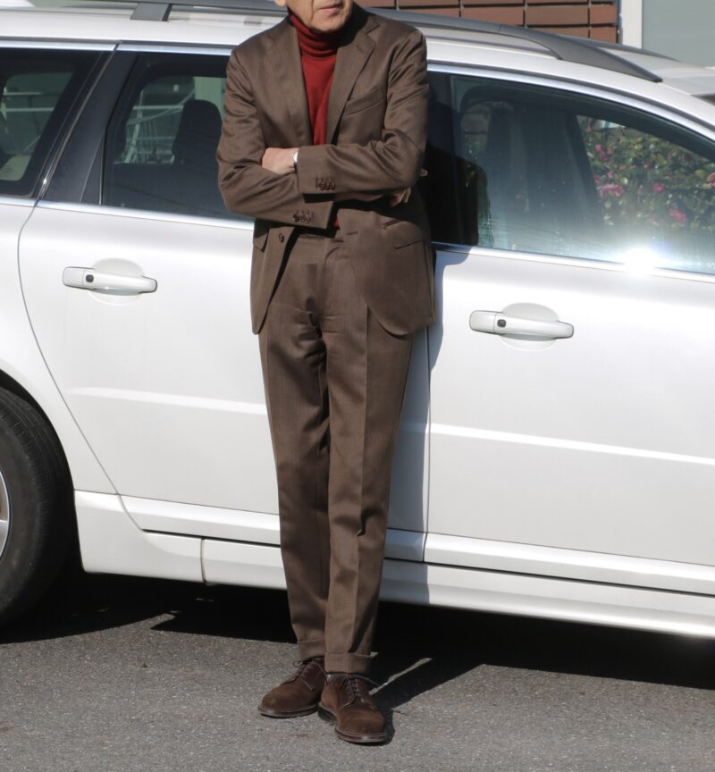 インスタやユーチューブに流れるイタリア・フィレンツェで開催されているPITTI UOMOの風景。会場に訪れる洒落者たちは、以前にもまして華やかさを競っているようです。ややコスプレ感はありますが、参考になることの多いイベントです。特に、今回、ダウンではなくコートスタイルが目につき、その周辺アイテムはカラフル。インナーのニットや巻物なども大胆な配色のものが目につきます。クラシックなコートだからこそできるコーディネートなんでしょうね。私も負けじと、クローゼットから取り出したのが、カージナルレッドのタートルネック。英国のWILLIAM LOCKIE/ウィリアムロッキーのものです。この冬、初の出番となります。ブラウンのスーツ(De Petrillo/デ・ペトリロ)と靴下( SOZZI/ソッツィ)はイタリアもの。着ている私は日本人と、英・伊・日の三国同盟です。