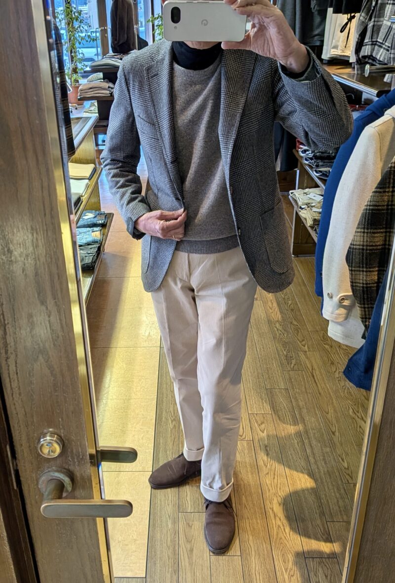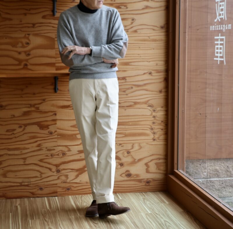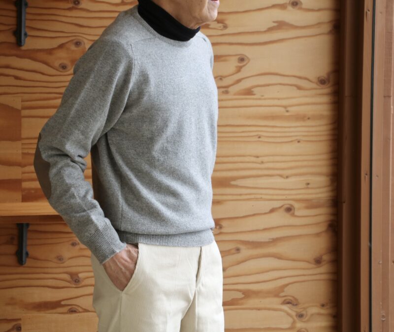 ニットはWILLIAM LOCKIE/ウイリアム・ロッキーのクルーネックセーター。ラムズウールの無地にエルボーパッチ付きはカシェート別注モデルです。サイズ38を着用しており、色違いのチャコルグレイが気になるところです。インにシャツを合わせるつもりでしたが、凍える寒さ。タートルネックに着替えました。